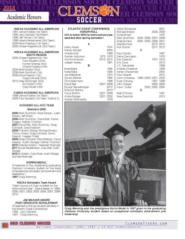 ACADEMIC ALL-ACC TEAM Started in 2005 2005-Mark Buchholz, Brad Gibson, Justin Moore, Jeff Routh 2006-Mark Buchholz, David Bell, Parker Rogers, Nathan Thornton 2007-David Bell, Mark Buchholz, Greg Eckhardt, David Newton 2008-Francklin Blaise, Michael Brooks, Tommy Drake, Greg Eckhardt, David Newton, Keegan Priest 2009-Greg Eckhardt, Mike Mattson, David Newton, Austin Savage, Nathan Thornton 2010-George Godwin, Alexander Stockinger 2011-Brynjar Benediktsson, Cody Miell, Austin Savage 2012-Bo Godwin, Cody Mizell, Austin Savage, and Alex Stockinger. NORRIS MEDAL (Presented to the outstanding graduating Clemson University student on the basis of exceptional scholastic achievement and leadership.) 1997-Craig Wenning NSCAA Scholastic Team Award (Team having a 3.0 gpr or better for the entire school year. Award began in 1996) 2000, 2001, 2002, 2003, 2004, 2007, 2009, 2010 JIM WEAVER AWARD POST-GRADUATE SCHOLARSHIP (Presented to the top student-athletes in the Atlantic Coast Conference) 1994 - Jaro Zawislan 1997 - Craig Wenning