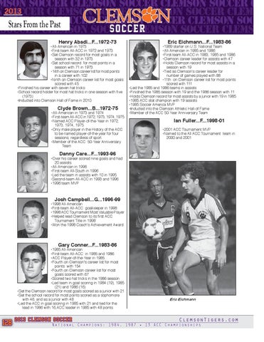 Eric Eichmann...F...1983-86 •1989 starter on U.S. National Team •All-American in 1985 and 1986 •First-team All-ACC in 1983, 1985 and 1986 •Clemson career leader for assists with 47 •Holds Clemson record for most assists in a season with 19 •Tied as Clemson's career leader for number of games played with 88 •11th on Clemson career list for most points scored with 111 •Led the 1985 and 1986 teams in assists •Finished the 1985 season with 19 and the 1986 season with 11 •Holds Clemson record for most assists by a junior with 19 in 1985 •1985 ACC stat champion with 19 assists •1985 Soccer America MVP •Inducted into the Clemson Athletic Hall-of Fame •Member of the ACC 50-Year Anniversary Team