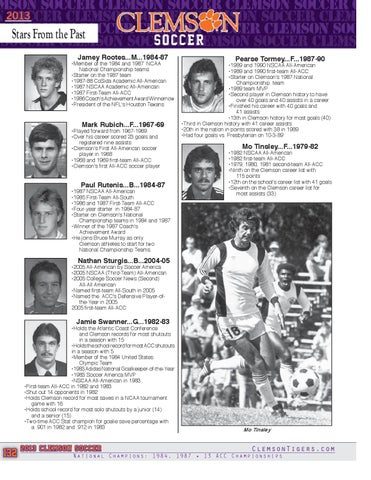 Mo Tinsley...F...1979-82 •1982 NSCAA All-American •1982 first-team All-ACC •1979, 1980, 1981 second-team All-ACC •Ninth on the Clemson career list with 115 points •12th on the school's career list with 41 goals •Seventh on the Clemson career list for most assists (33)