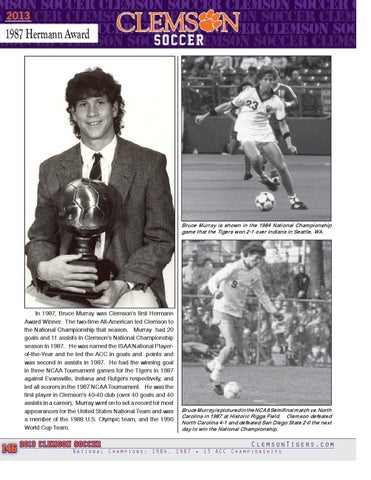 In 1987, Bruce Murray was Clemson's first Hermann Award Winner. The two-time All-American led Clemson to the National Championship that season. Murray had 20 goals and 11 assists in Clemson's National Championship season in 1987. He was named the ISAA National Playerof-the-Year and he led the ACC in goals and points and was second in assists in 1987. He had the winning goal in three NCAA Tournament games for the TIgers in 1987 against Evansville, Indiana and Rutgers respectively, and led all scorers in the 1987 NCAA Tournament. He was the first player in Clemson's 40-40 club (over 40 goals and 40 assists in a career). Murray went on to set a record for most appearances for the United States National Team and was a member of the 1988 U.S. Olympic team, and the 1990 World Cup Team.