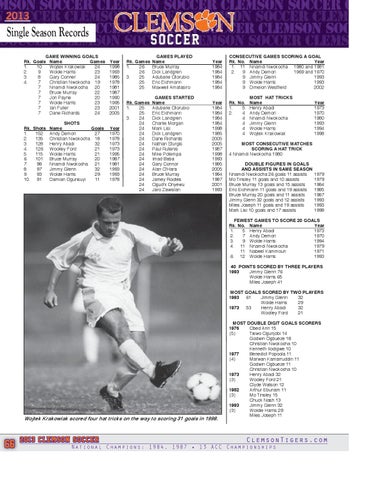 MOST CONSECUTIVE MATCHES SCORING A HAT TRICK 4 Nnamdi Nwokocha 1980 DOUBLE FIGURES IN GOALS AND ASSISTS IN SAME SEASON Nnamdi Nwokocha 26 goals 11 assists Mo Tinsley 11 goals and 10 assists Bruce Murray 13 goals and 15 assists Eric Eichmann 11 goals and 19 assists Bruce Murray 20 goals and 11 assists Jimmy Glenn 32 goals and 12 assists Miles Joseph 11 goals and 19 assists Mark Lisi 10 goals and 17 assists