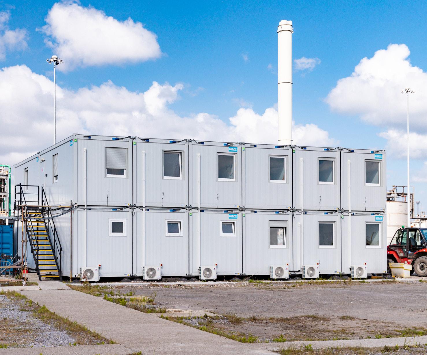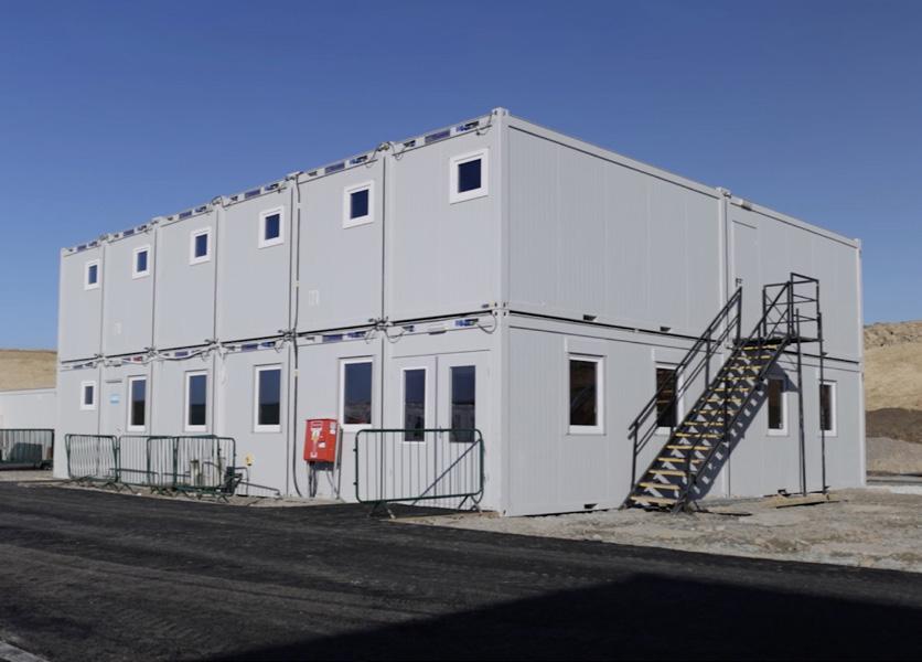 For this project, we supplied: Seven 32ft canteens, eight 32ft offices, five 32ft drying rooms, two 32ft heart units (double office), Three 10ft Stores, One 10ft COSHH Store, Two 20ft Stores with electrics and racking, Two 6+1 Toilet + Shower, One 3+1 Toilet block, four tanks, and five staircases for stacked units.