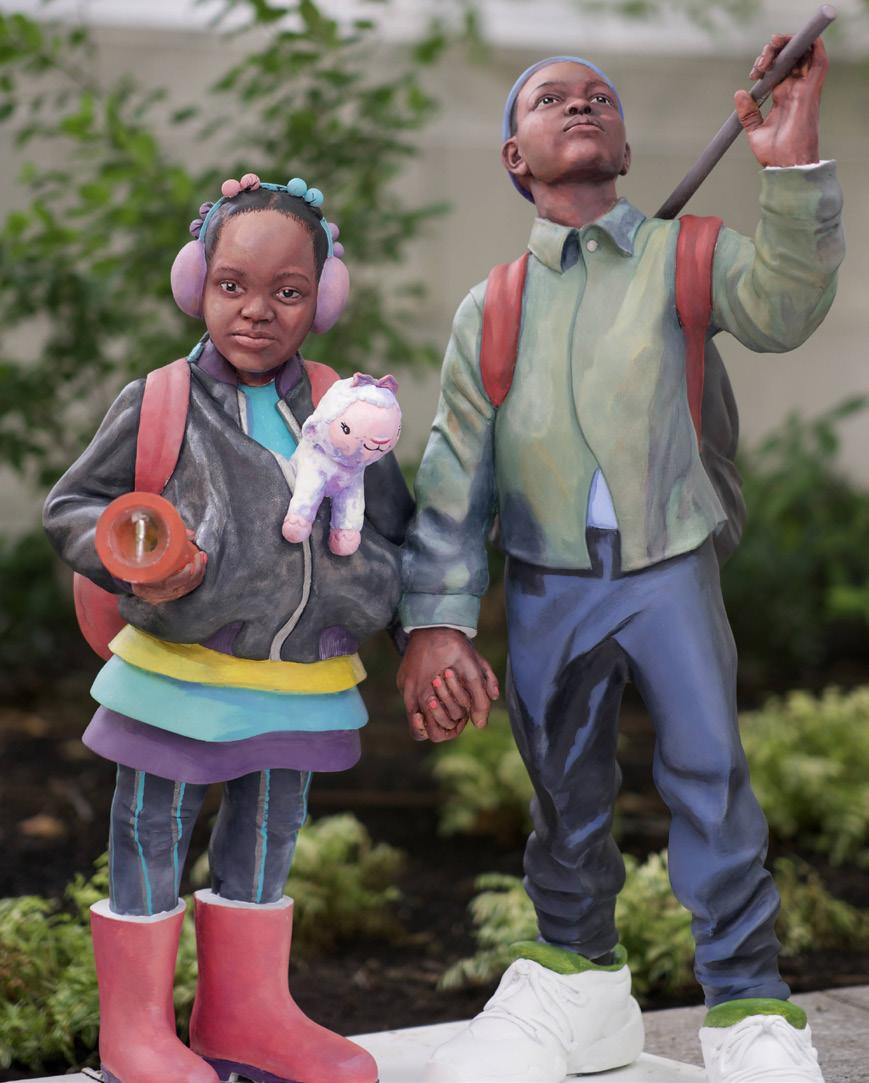 Cleveland Public Library inspired through the discovery of arts and culture. The Library used art to embrace discovery, creativity, and change in our community. In collaboration with LAND studio, the See Also public art series showcased Cleveland artist Darius Steward’s first sculpture project, titled Baggage Claim, in Search of New Beginnings. The art exhibition featured six life-sized sculptures of children modeled after Steward’s son and daughter depicting the burdens that children carry. The installation in the Eastman Reading Garden was complemented by a related mural at the Harvard-Lee Branch. The mural featured Steward’s son, daughter, and nephew looking ahead with the guiding light of a flashlight. The sculptures were permanently moved to the Youth Services Department in Main Library.