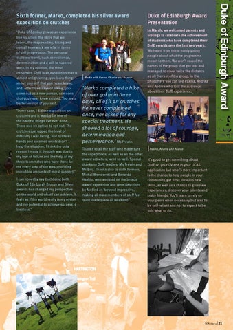‘Marko completed a hike of over 40km in three days, all of it on crutches. He never complained once, nor asked for any special treatment. He showed a lot of courage, determination and perseverance.’ Ms Frewin Thanks to all the staff who made sure the expeditions, as well as all the other award activities, went so well. Special thanks to DofE leaders, Ms Frewin and Mr Bird. Thanks also to sixth formers, Michal Wensierski and Benardo Haxhiu, who assisted on the bronze award expedition and were described by Mr Bird as ‘beyond impressive, making all male members of staff feel quite inadequate all weekend.’
