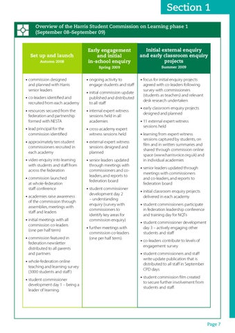 •• commission launched at whole-federation staff conference •• academies raise awareness of the commission through assemblies, meetings with staff and leaders •• initial meetings with all commission co-leaders (one per half term) •• commission featured in federation newsletter distributed to all parents and partners •• whole-federation online teaching and learning survey (3000 students and staff ) •• student commissioner development day 1 – being a leader of learning.