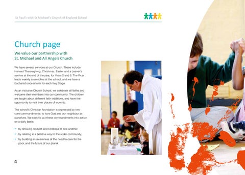 Church page We value our partnership with St. Michael and All Angels Church We have several services at our Church. These include Harvest Thanksgiving, Christmas, Easter and a Leaver’s service at the end of the year, for Years 2 and 6. The Vicar leads weekly assemblies at the school, and we have a Eucharist once a term for each Key Stage. As an inclusive Church School, we celebrate all faiths and welcome their members into our community. The children are taught about different faith traditions, and have the opportunity to visit their places of worship. The school’s Christian foundation is expressed by two core commandments: to love God and our neighbour as ourselves. We seek to put these commandments into action on a daily basis: • by showing respect and kindness to one another, • by relating in a positive way to the wider community, • by building an awareness of the need to care for the poor, and the future of our planet.