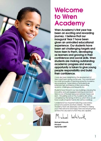 Welcome to Wren Academy Wren Academy’s first year has been an exciting and rewarding journey. I believe that our inaugural Year 7 have been given an unrivalled educational experience. Our students have been set challenging targets and have risen to them, developing as learners and growing in their confidence and social skills. Wren students are making outstanding academic progress and every opportunity is taken to give young people responsibility and build their confidence. I have also been delighted by the development of Wren’s staff team during our first year. The commitment from staff and quality of teaching across the Academy are exceptional. Expectations of all students are extremely high and lessons at Wren are exciting, dynamic, challenging and frequently fun. Students have thrived in our new buildings, enjoying the innovative and well equipped learning environment. Wren is one of the best resourced schools I have ever seen. All building work on the Academy site will be completed by the Spring of 2010, by which time we will have a suite of superb twenty first century buildings. I understand how important selecting a secondary school is for parents and their children. The Wren Academy team are absolutely committed to making your child welcome and happy here and ensuring they achieve the very best of which they are capable.