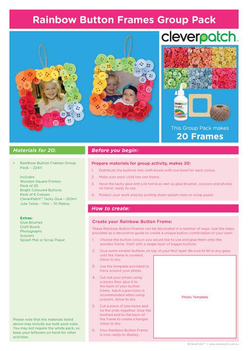 Group pack includes all components required to create 20 Button Frames. Measures approximately 11 x 11cm (not including hanger) when assembled. Scissors are required to complete this activity (sold separately). Contents may vary. *Savings based on component prices.