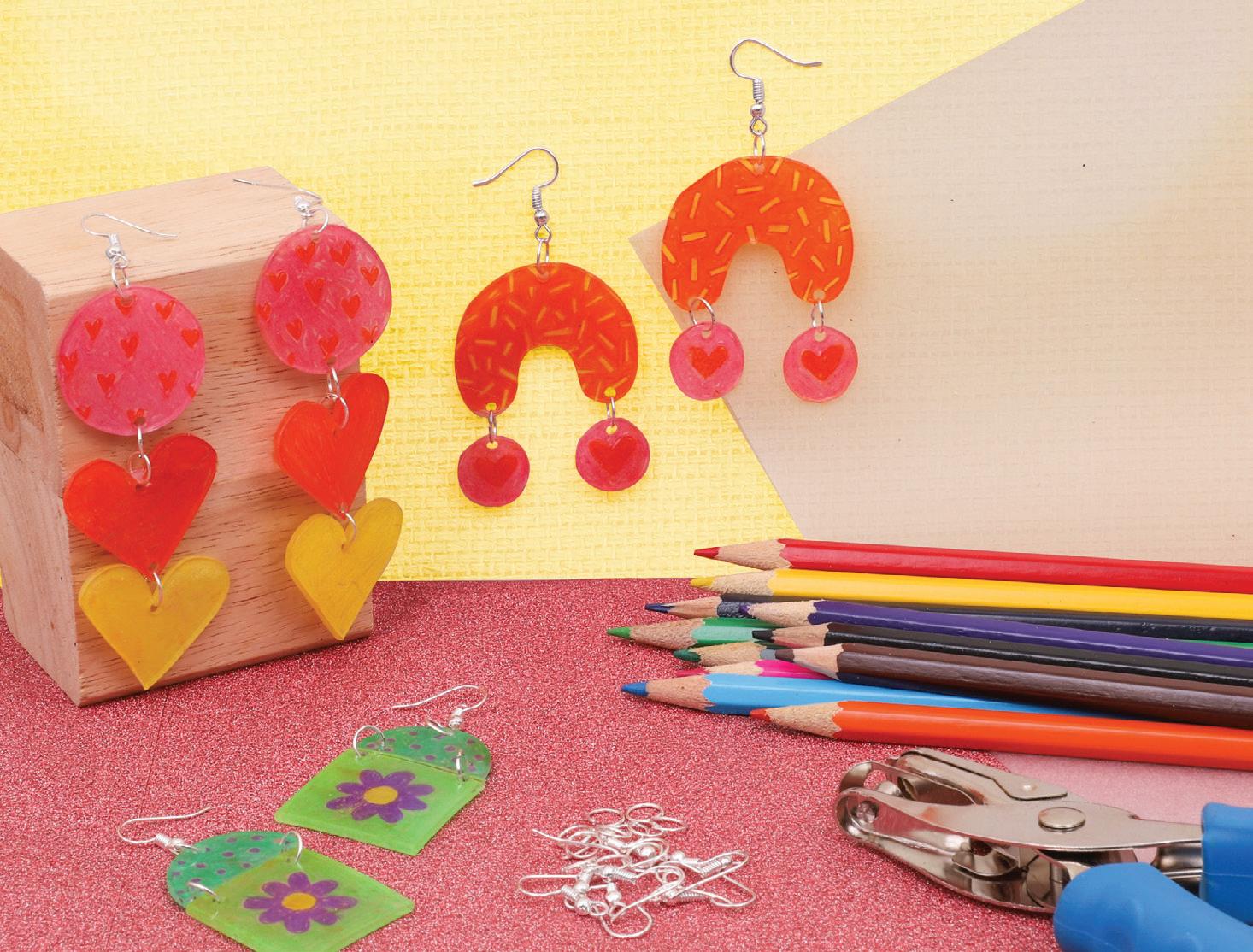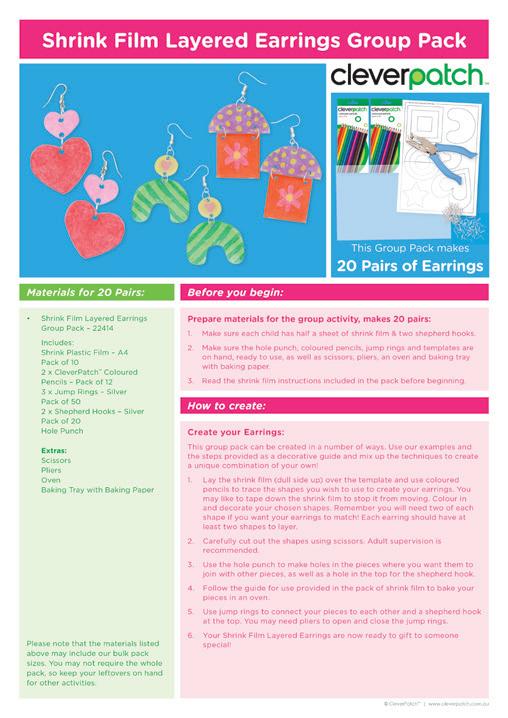 Group pack includes all components required to create 20 pairs of Shrink Film Earrings. Size will vary based on baking and chosen design. Scissors, pliers and an oven are required to complete this activity (not included).