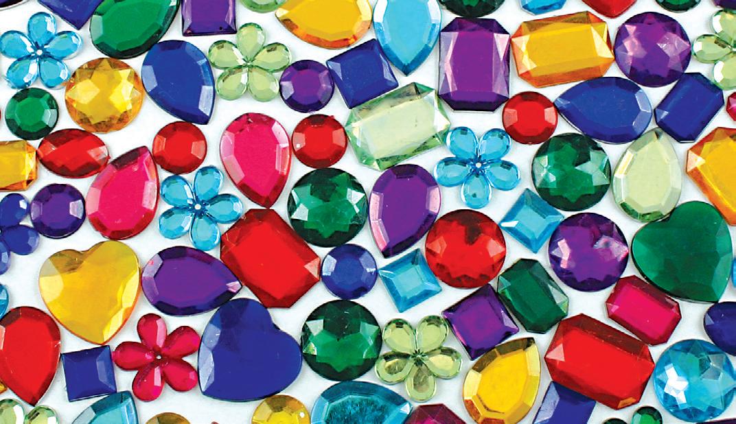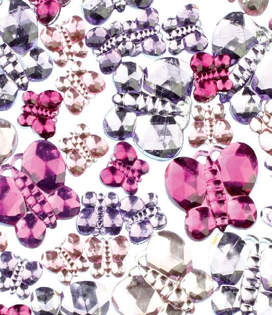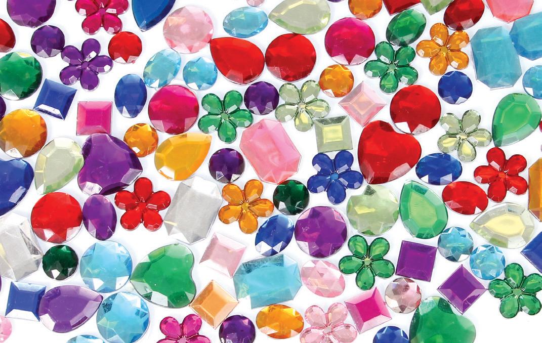 Assorted shapes, sizes and colours. 450g pack includes approximately 650 pieces. Large round rhinestone measures 2cm in diameter.