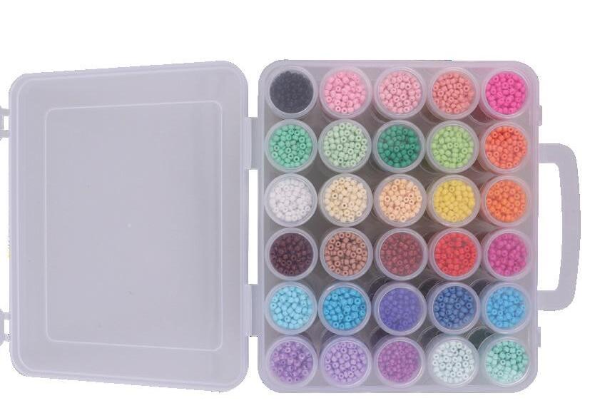 Approximately 15,000 beads. 30 assorted colours (20g of each colour). Each colour is individually packed in separate tubs supplied in a storage case. Measures 2mm in diameter. Colours may vary.