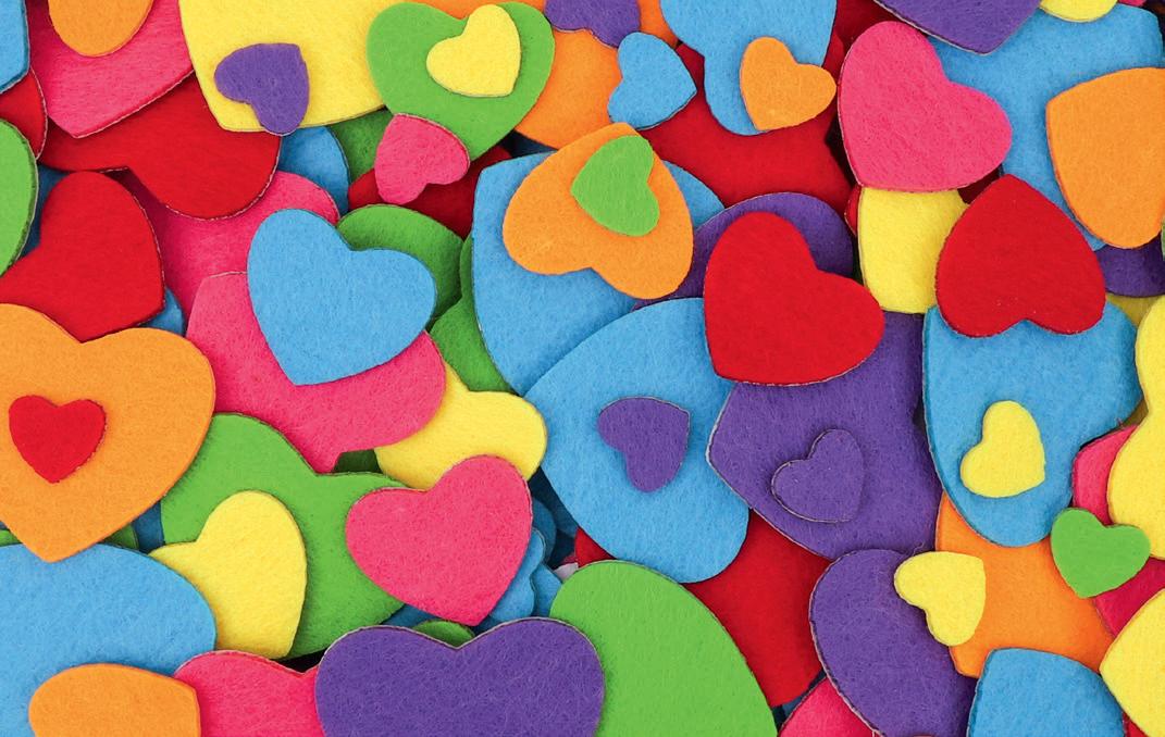 Self-adhesive. Assorted shapes, sizes and colours. Supplied in sheet form. Largest sticker measures approximately 4cm in diameter. Felt Stickers – Hearts –