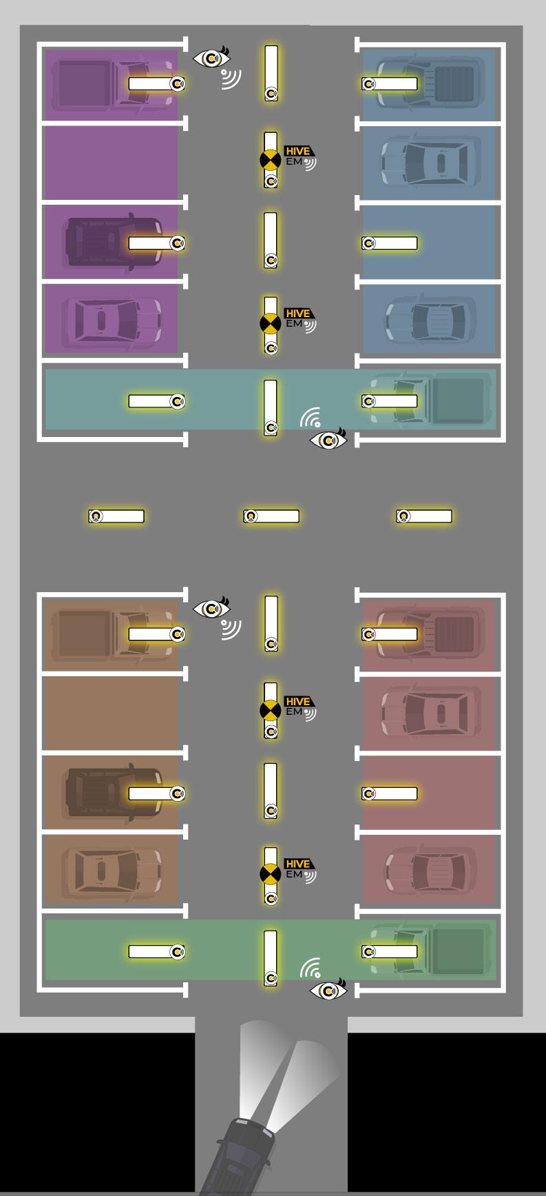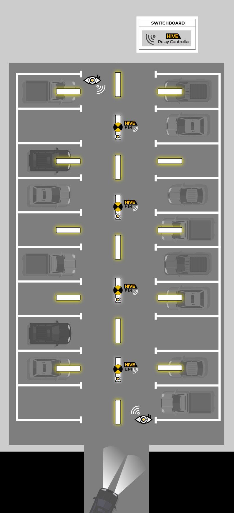 Involves stand-alone or integral HIVE sensors to activate banks of luminaires upon presence detection on entry. Every second driveway luminaire is a HIVE Combine emergency luminaire with integrated sensor to also detect presence and dim to a set level after timing elapses.