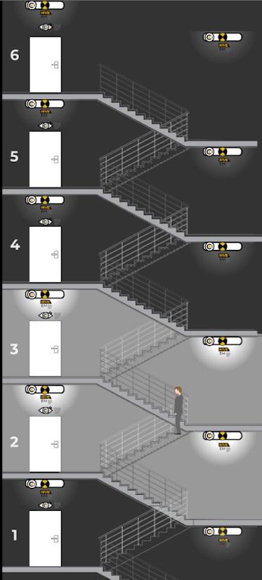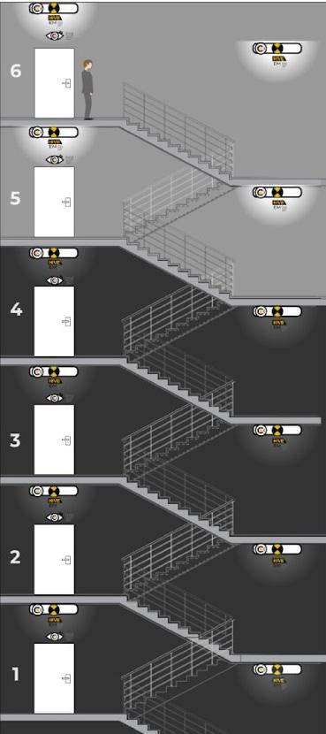 All luminaires in this example are emergency HIVE Combine enabled, using stand-alone motion sensors or sensors built into the luminaire at the entry door. Presence on entry turns the landing and half-landing luminaires on and simultaneously turns on the luminaires at the level above and below.