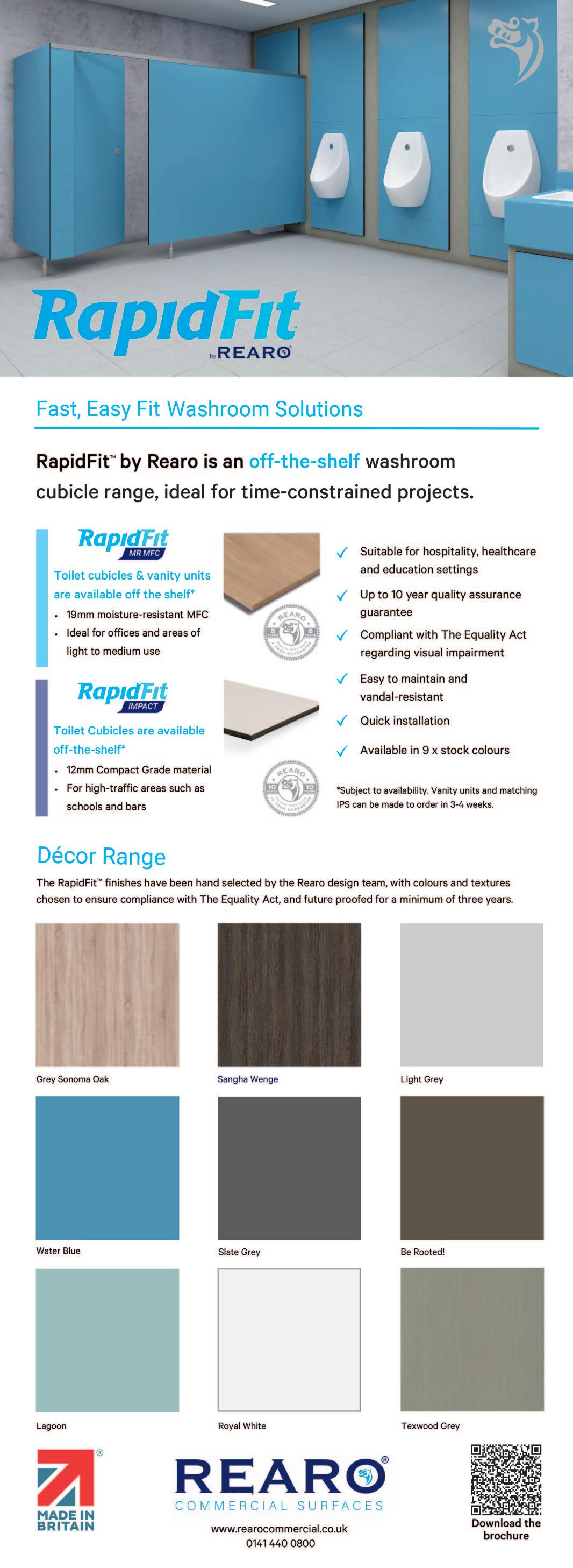 • Durability: Options for both light and heavy-duty use. Contact your local fitter, joiner, or plumber to request free sample packs and design assistance. Or order your RapidFit washroom directly today. commercial@rearo.co.uk www.rearocommercial.co.uk Call us on 0141 440 0800