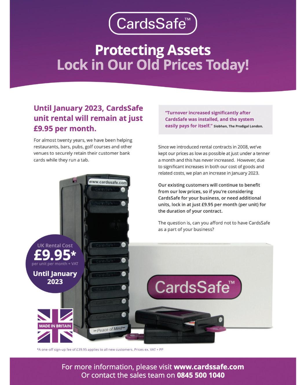 Our existing customers will continue to benefit from our low prices, so if you ’ re considering CardsSafe for your business, or need additional units, lock in at just £9 95 per month (per unit) for the duration of your