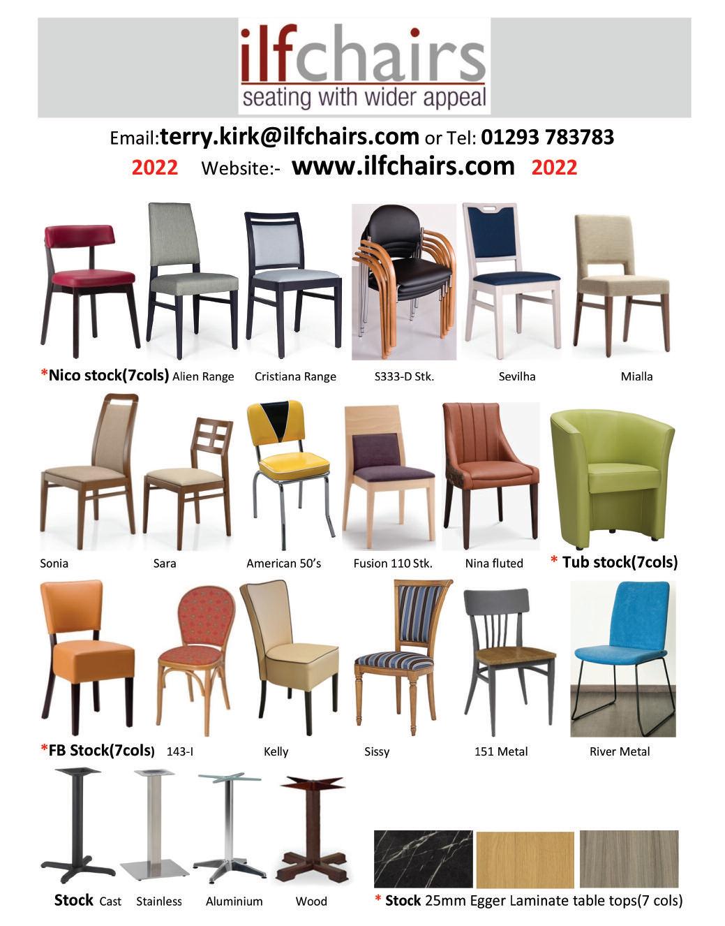 With the continued success of the ILF Chairs comprehensive website , ILF have now added to the 2 chairs already stocked in 7 colours, a stock armchair in 7 dif ferent Faux colours matching the chairs, plus a 6 colour range stock of Egger laminated table tops in a selection of sizes A full range of table bases are also kept in stock