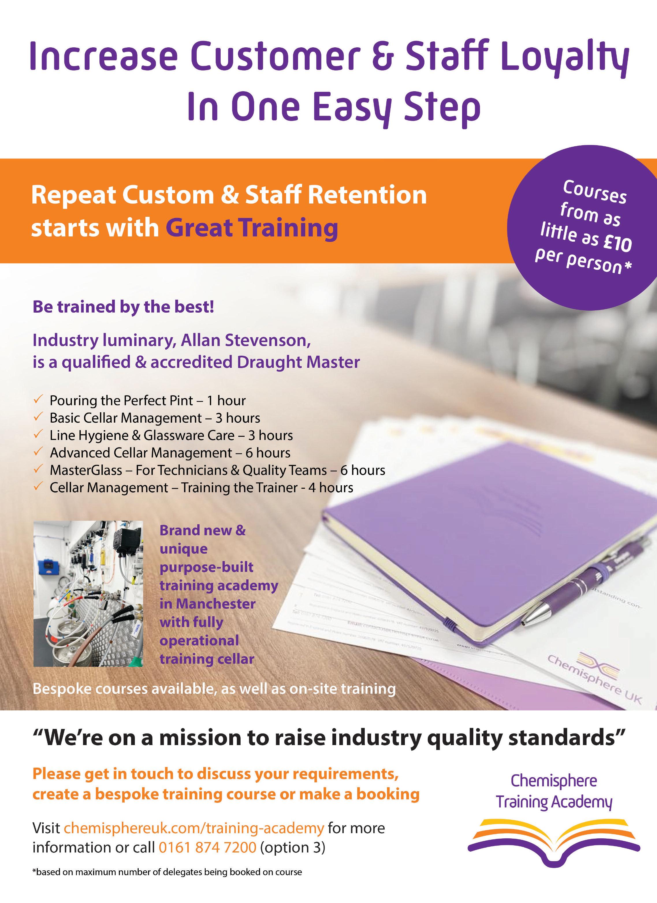 This is something Chemisphere UK are ver y aware of and is one of many reasons behind the opening of their brand new Training Academy at their Trafford Park head office The unique facility brings together classroom training with real hands-on practical training in their purpose-built fully operational training cellar This set-up means delegates can learn all the theor y and then put it into practice immediately – honing their skills until they get it right