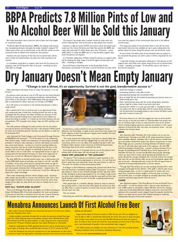 MAKE DRY JANUARY A “TRY JANUARY” “Try January”? Yes, Try January, an initiative to spark positivity at the start of the year and encourage people to come out, try new food and drink in pubs, bars and restaurants rather than stay indoors or stick to ‘The usual.’ An initiative to beat those January blues! It all began in 2014, following a meeting with cocktail chain Be At One, who had launched a marketing initiative called “Try January” to encourage people to order its new cocktails through the bar’s app, after which an idea developed to encourage people to try new things in pubs across the entire trade, helping boost pubs during the quiet spell, and also helping lift people’s mood at the start of the year by getting experimental with food and drink. With people look to a healthier lifestyle, operators need to embrace this growing trend to make sure that when guests do venture out, they can offer them a variety of options to ensure they visit you rather than the pub down the road. This can include: • Maximising your alcohol free offering by getting creative, maybe include
