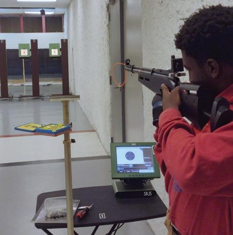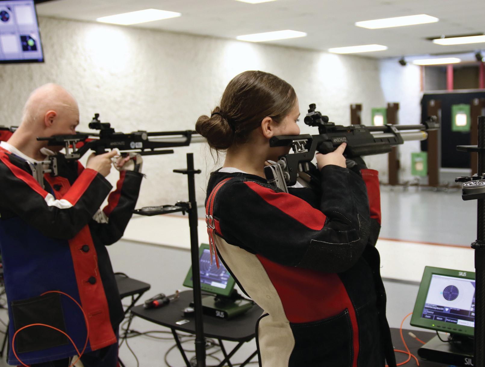 By Ally Bennett ’23the athlete can see each shot's impact on the target immediately after it is fired. A main computer ties all the firing points together so the Range Officer or Coach can see in real time what each shooter is doing. Additionally, a 54-inch monitor hangs from the ceiling to allow spectators to watch the competitors during a match.