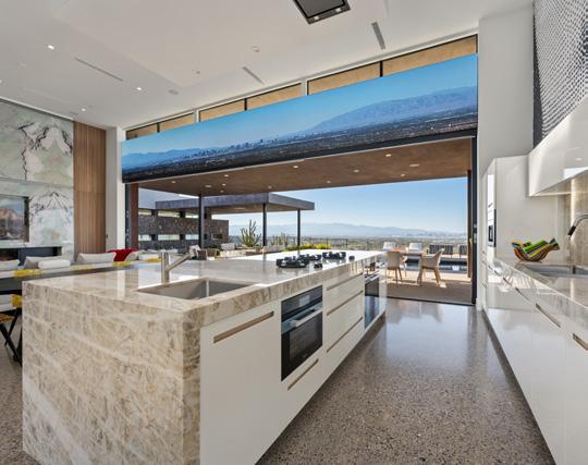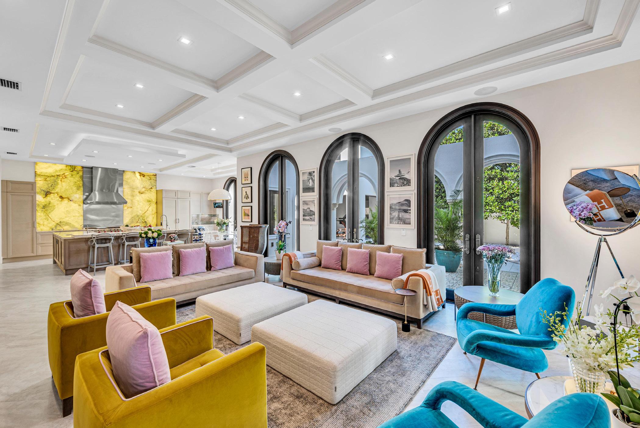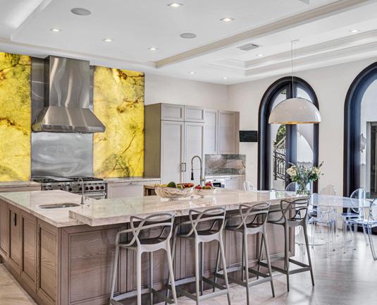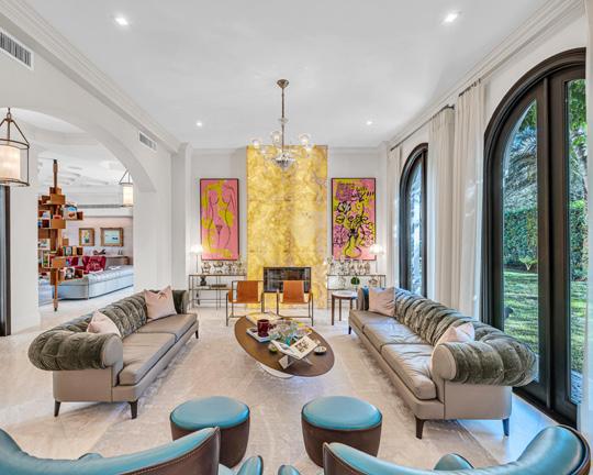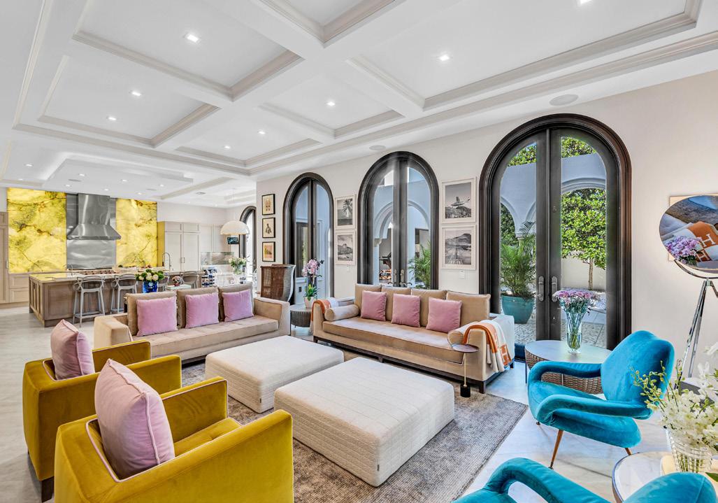 oversized pool, putting green, dedicated sports bar/game room, temperature-controlled wine room, and in-home theater. Curated with Italian furniture by Edra, designer rugs by Alexander McQueen and Fornasetti Italian wall mosaics. Main kitchen is dressed in exotic quartzite, luxurious Italian cabinetry and Meile/Sub-Zero appliances. Second kitchen is out-of-sight. Primary suite is a glamorous sanctuary featuring a night-cap and coffee bar, spa-shower, custom Poliform closet and extraordinary views. ■