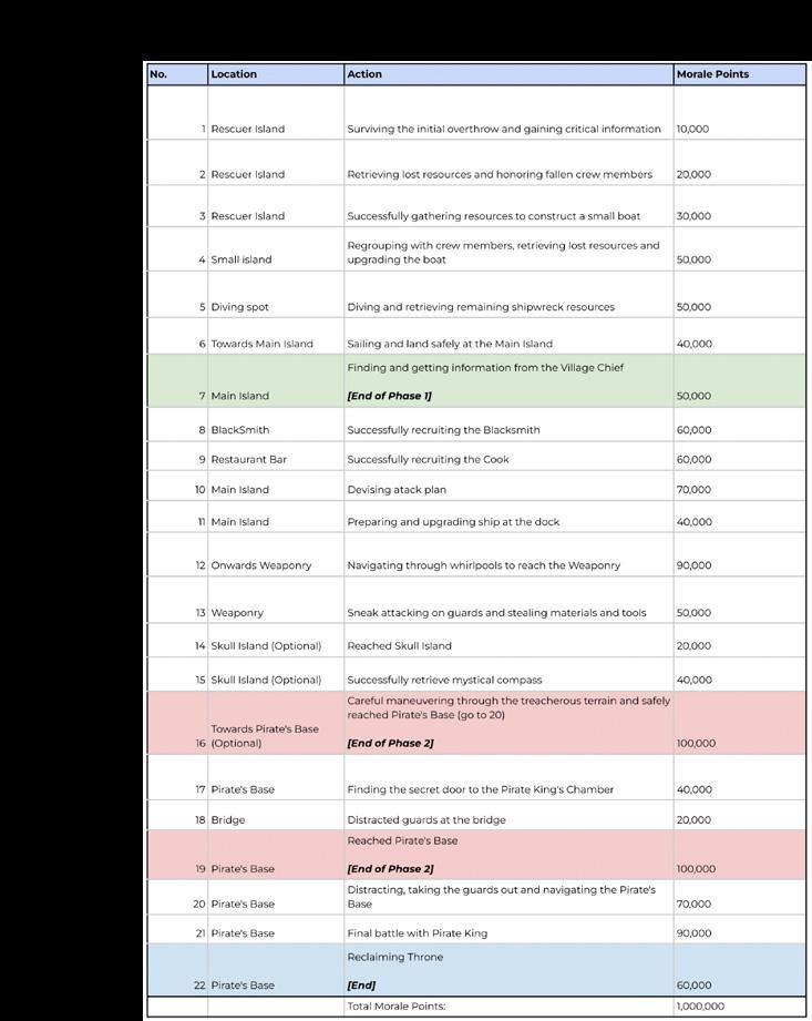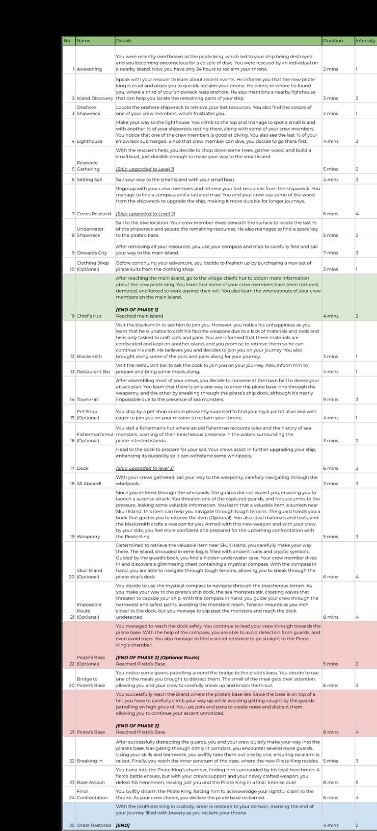 I designed the sub-objectives to naturally progress towards the main goal, ensuring the first sub-objective, gathering lost resources and reaching the main city, is only complete upon arrival, making it more engaging. To build momentum, I integrated key interaction events that align with the theme, starting with a strong hook and maintaining engagement through peaks and valleys, concluding satisfyingly.