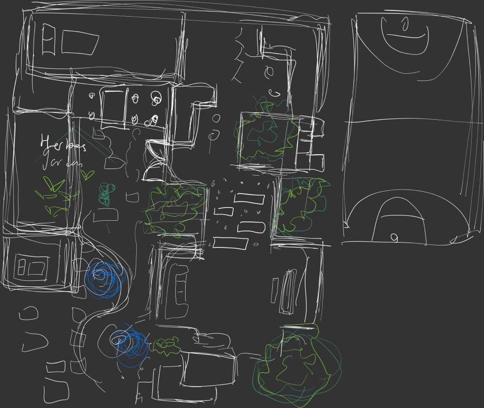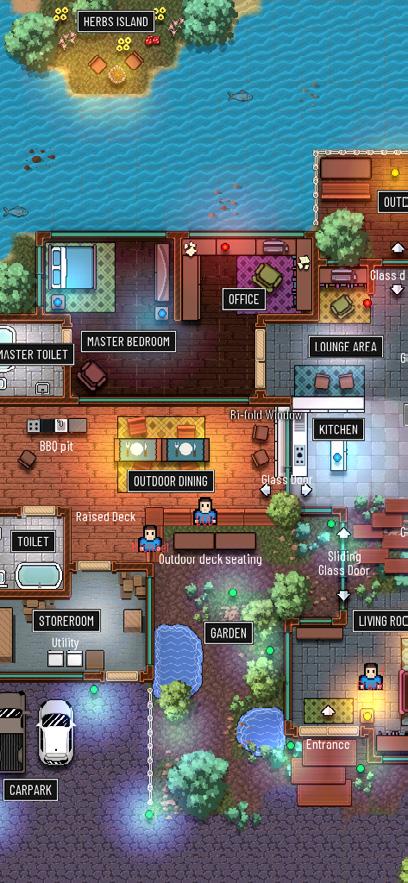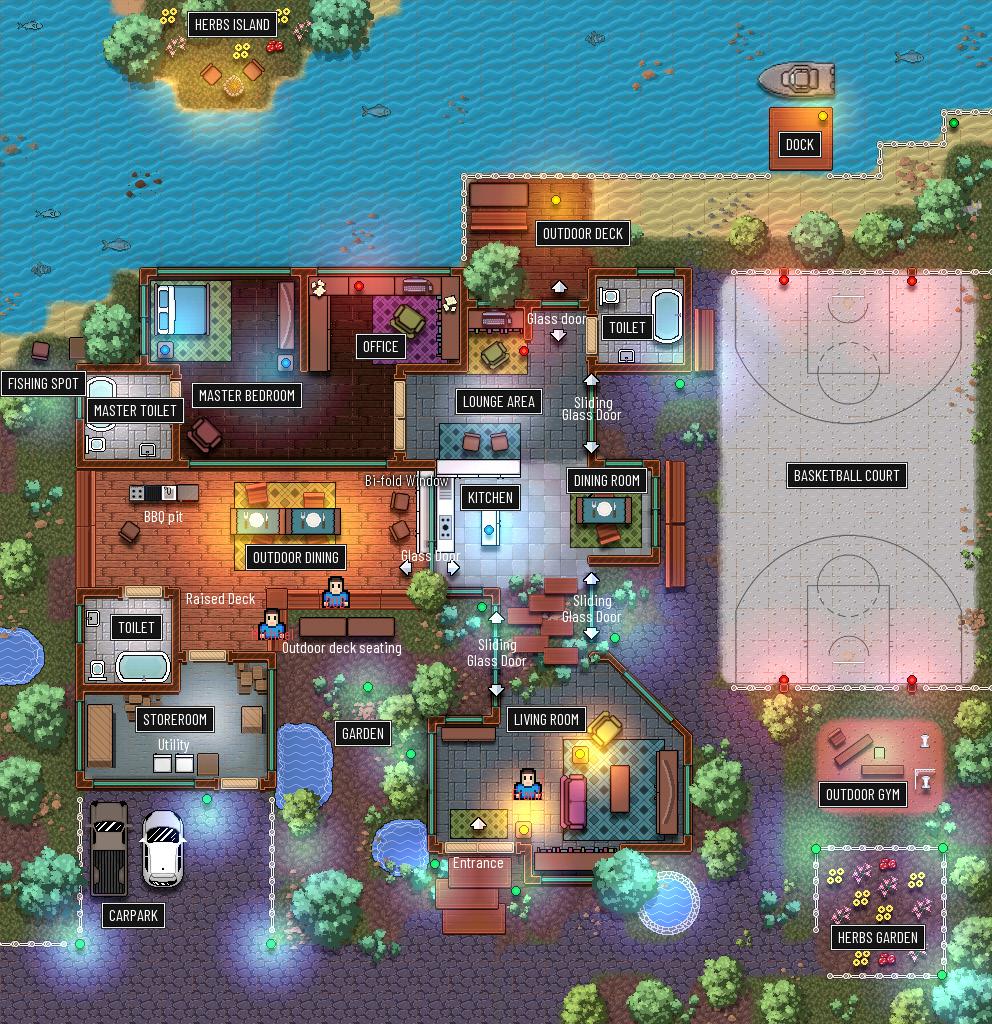In the next project, we were tasked with creating a 20m x 20m house on a total area of 1000m², including the surrounding environment. Continuing with the occupation of a Landscape Architect, I researched integrating greenery throughout the house. Given the larger scope, I started with sketches to envision the layout. In the final design, I ensured that each space within the house connected to the outdoors through windows, and incorporated greenery to “cut through” the house between the living and kitchen areas. To add character, I included a basketball court and a herb island accessible by boat for harvesting.