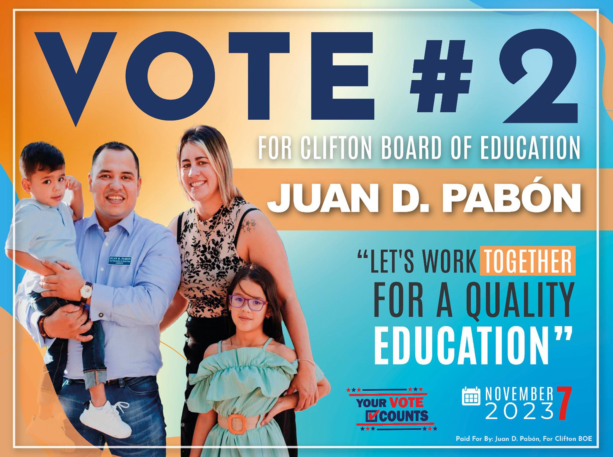 Running for the BOE is one way for Pabon to set an example for his own kids. He and his wife, Laura, have been Clifton homeowners for five years. Their daughter, Celeste, attends School 4 and their son, Noah, started PreK this year.