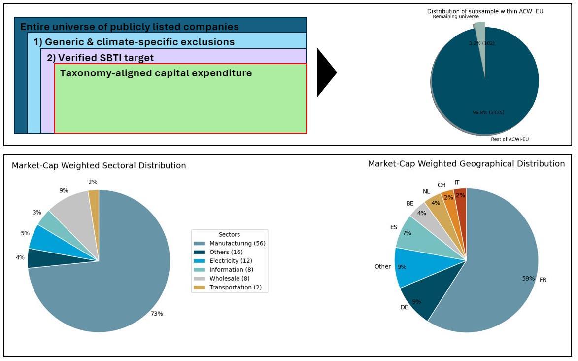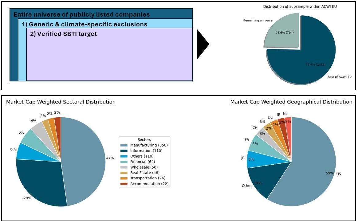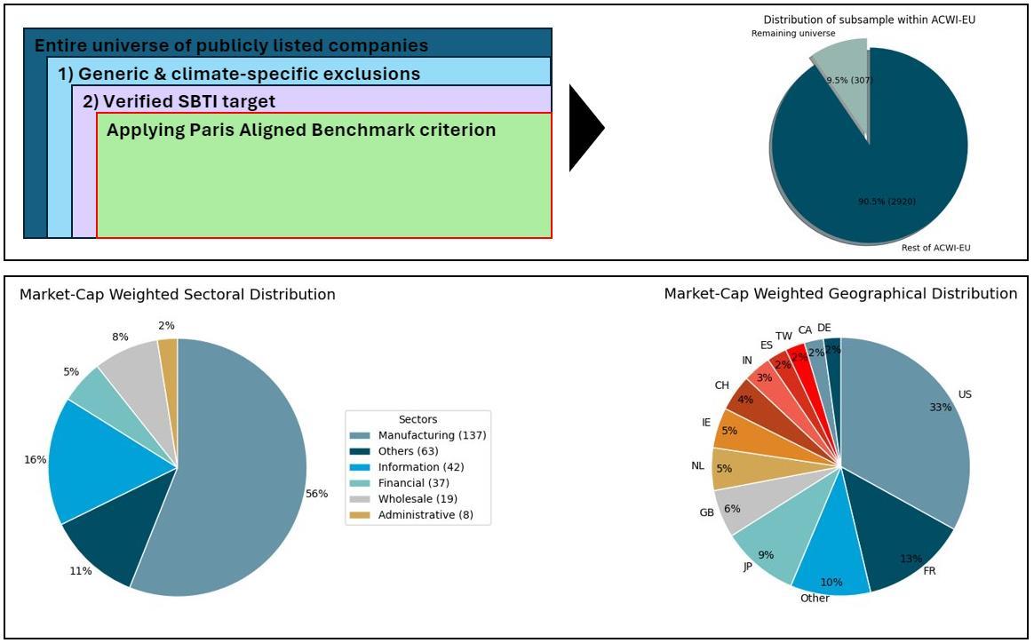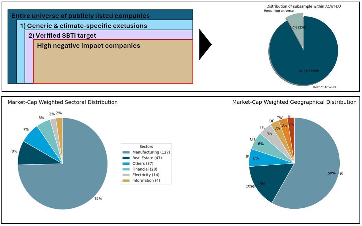 This figure shows the distribution by weighted market cap, sectoral distribution and geographical distribution of the remaining universe after implementation of general exclusions, climatespecific exclusions and positive screening criteria (companies must have a verified sciencebased target).