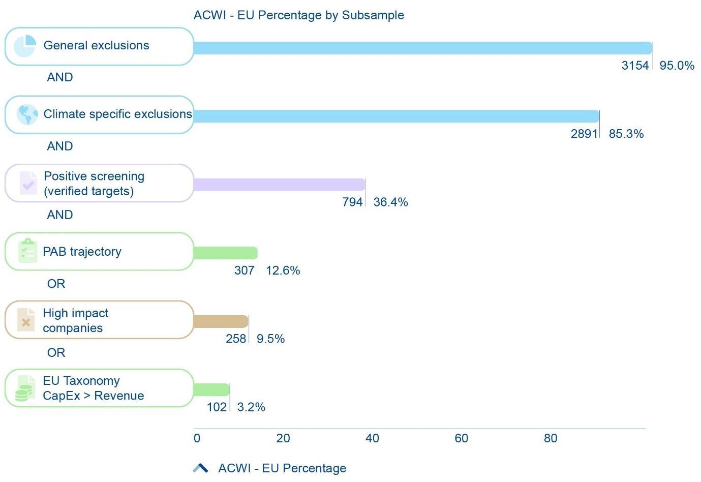 Subject to the precise criteria, the investable universe shrinks, making it more difficult to build products with reasonable risk-return considerations. To provide evidence-based feedback, we collected relevant data points for the ACWI-EU universe and exemplify different sets of criteria. For the positive screening criteria, forward-looking data on targets has been collected from CDP, SBTI and the Transition Pathway Initiative. EU Taxonomy-alignmentdatawasprovidedbyClarityAI. Thenegativescreeningcriteriawere implementedwithdatafromthe FinancialExclusionTrackerproject,aswellastheGlobal Coal Exit List (GCEL) and Global Oil and Gas Exit List (GOGEL) from Urgewald. The Technical Appendix (Data Description) provides more details on data sources.
