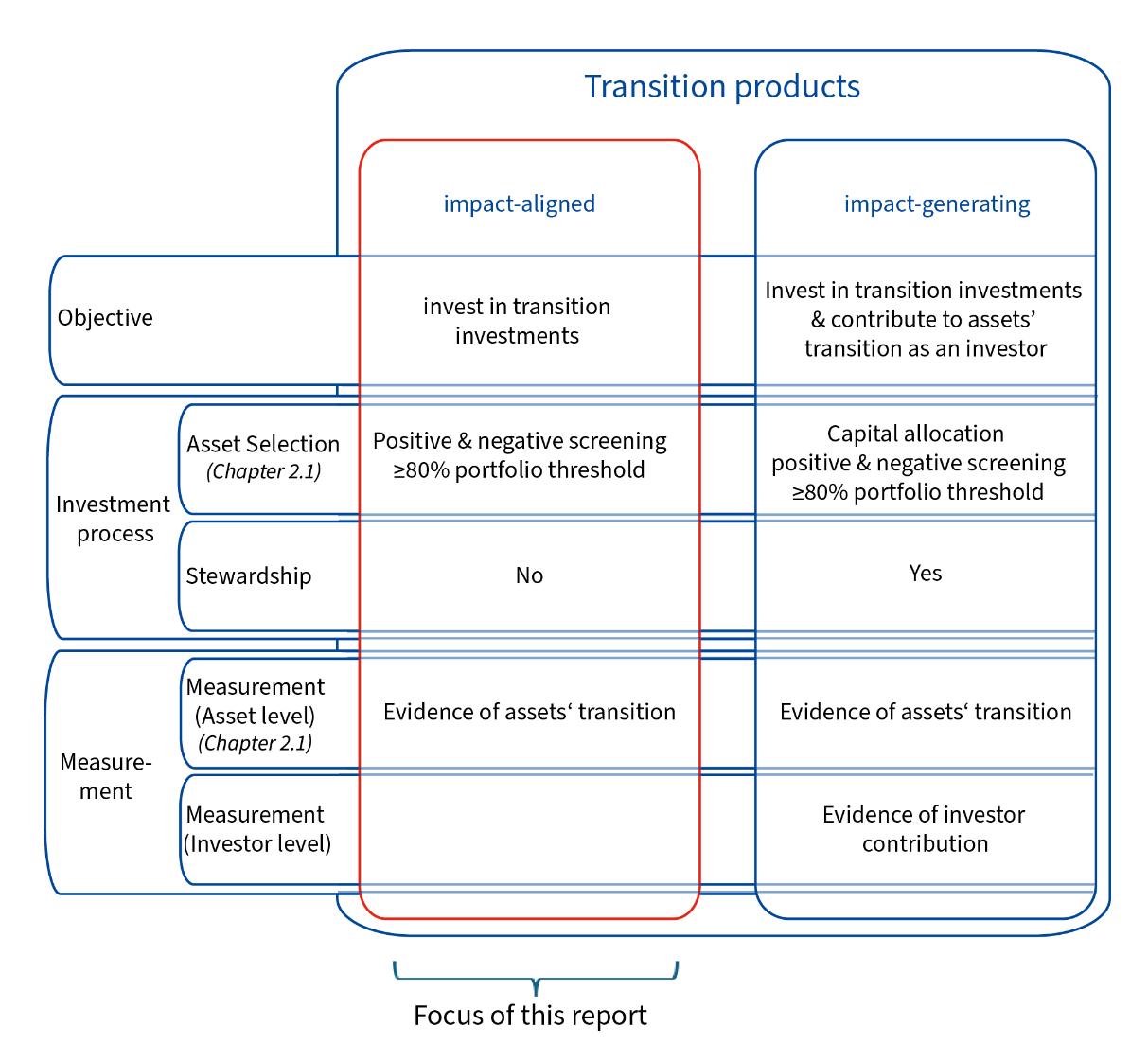 Both asset selection (i.e. capital allocation) and stewardship approaches can lead to investor impact or investor contribution (Kölbel et al., 2020). 12 We define investor contribution as the “contribution that the investor makes to enable enterprises (or intermediary investment managers) to achieve impact.” (IMP, 2024). Differentiating whether a transition product aims for investor contribution or not is important to prevent impact-washing according to ESMA (ESMA, 2023b).13 We use Busch & Pruessner’s (2023) approach to differentiate transition products (see Table 2). For public equity markets, investor contribution through capital allocation is difficult to establish, which is why this report’s conclusion recommends implementing investor stewardship, especially for transition products investing in public equity (see Infobox on Investor Stewardship and Engagement below)