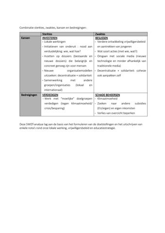 Deze SWOT-analyse lag aan de basis van het formuleren van de doelstellingen en het uitschrijven van enkele nota’s rond onze lokale werking, vrijwilligersbeleid en educatiestrategie.