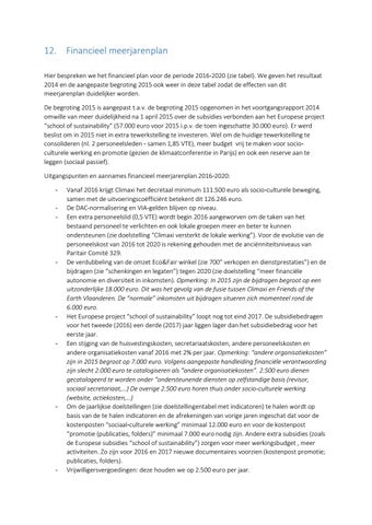 12. Financieel meerjarenplan Hier bespreken we het financieel plan voor de periode 2016-2020 (zie tabel). We geven het resultaat 2014 en de aangepaste begroting 2015 ook weer in deze tabel zodat de effecten van dit meerjarenplan duidelijker worden. De begroting 2015 is aangepast t.a.v. de begroting 2015 opgenomen in het voortgangsrapport 2014 omwille van meer duidelijkheid na 1 april 2015 over de subsidies verbonden aan het Europese project “school of sustainability” (57.000 euro voor 2015 i.p.v. de toen ingeschatte 30.000 euro). Er werd beslist om in 2015 niet in extra tewerkstelling te investeren. Wel om de huidige tewerkstelling te consolideren (nl. 2 personeelsleden - samen 1,85 VTE), meer budget vrij te maken voor socioculturele werking en promotie (gezien de klimaatconferentie in Parijs) en ook een reserve aan te leggen (sociaal passief). Uitgangspunten en aannames financieel meerjarenplan 2016-2020: -