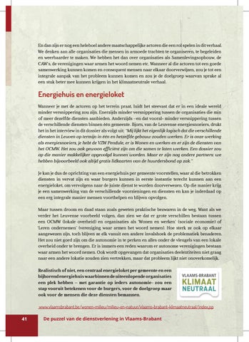 Energiehuis en energieloket Wanneer je met de actoren op het terrein praat, luidt het steevast dat er in een ideale wereld minder versnippering zou zijn. Enerzijds minder versnippering tussen de organisaties die min of meer dezelfde diensten aanbieden. Anderzijds –en dat vooral- minder versnippering tussen de verschillende diensten binnen één gemeente. Bjorn, van de Leuvense energiesnoeiers, drukt het in het interview in dit dossier als volgt uit: “Mij lijkt het eigenlijk logisch dat die verschillende diensten in Leuven op termijn in één en hetzelfde gebouw zouden werken. Er is onze werking als energiesnoeiers, je hebt de VZW Pendule, er is Wonen en werken en er zijn de diensten van het OCMW. Het zou ook gewoon efficiënt zijn om die samen te laten werken. Een dossier zou op die manier makkelijker opgevolgd kunnen worden. Maar er zijn nog andere partners: we hebben bijvoorbeeld ook altijd gratis lidkaarten van de huurdersbond op zak.” Je kan je dus de oprichting van een energiehuis per gemeente voorstellen, waar al die betrokken diensten in vervat zijn en waar burgers kunnen in eerste instantie terecht kunnen aan een energieloket, om vervolgens naar de juiste dienst te worden doorverwezen. Op die manier krijg je een samenwerking van de verschillende voorzieningen en diensten en kan je inderdaad op een erg integrale manier mensen voorthelpen en blijven opvolgen. Maar tussen droom en daad staan zoals geweten praktische bezwaren in de weg. Want als we verder het Leuvense voorbeeld volgen, dan zien we dat er grote verschillen bestaan tussen een OCMW (lokale overheid) en organisaties als ‘Wonen en werken’ (sociale economie) of ‘Leren ondernemen’ (vereniging waar armen het woord nemen). Hoe sterk ze ook op elkaar aangewezen zijn, toch blijven ze elk vanuit een andere invalshoek de problematiek benaderen. Het zou niet goed zijn om die autonomie in te perken en alles onder de vleugels van een lokale overheid onder te brengen. Er is immers een reden waarom er autonome verenigingen bestaan waar armen het woord nemen. Ook wordt opgevangen dat organisaties deelentiteiten niet graag naar een andere lokatie zouden zien vertrekken, maar dat probleem lijkt niet onoverkomelijk. Realistisch of niet, een centraal energieloket per gemeente en een bijhorend energiehuis waarbinnen de uiteenlopende organisaties een plek hebben – met garantie op ieders autonomie- zou een stap vooruit betekenen voor de burgers, voor de doelgroep maar ook voor de mensen die deze diensten bemannen. www.vlaamsbrabant.be/wonen-milieu/milieu-en-natuur/vlaams-brabant-klimaatneutraal/index.jsp 41