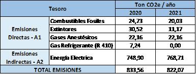 En la Clínica El Rosario sede Tesoro el total de la medición de la Huella de Carbono para los alcances 1 y 2 durante el año 2021 fue de 822,07 Ton CO2e /año. Durante el año 2021 en la sede Tesoro se obtuvo una reducción del 1,4% del global de emisiones con respecto a 2020; esto debido al cambio del gas presente en los Extintores y el uso de menos uso de combustibles fósiles, específicamente gas natural.