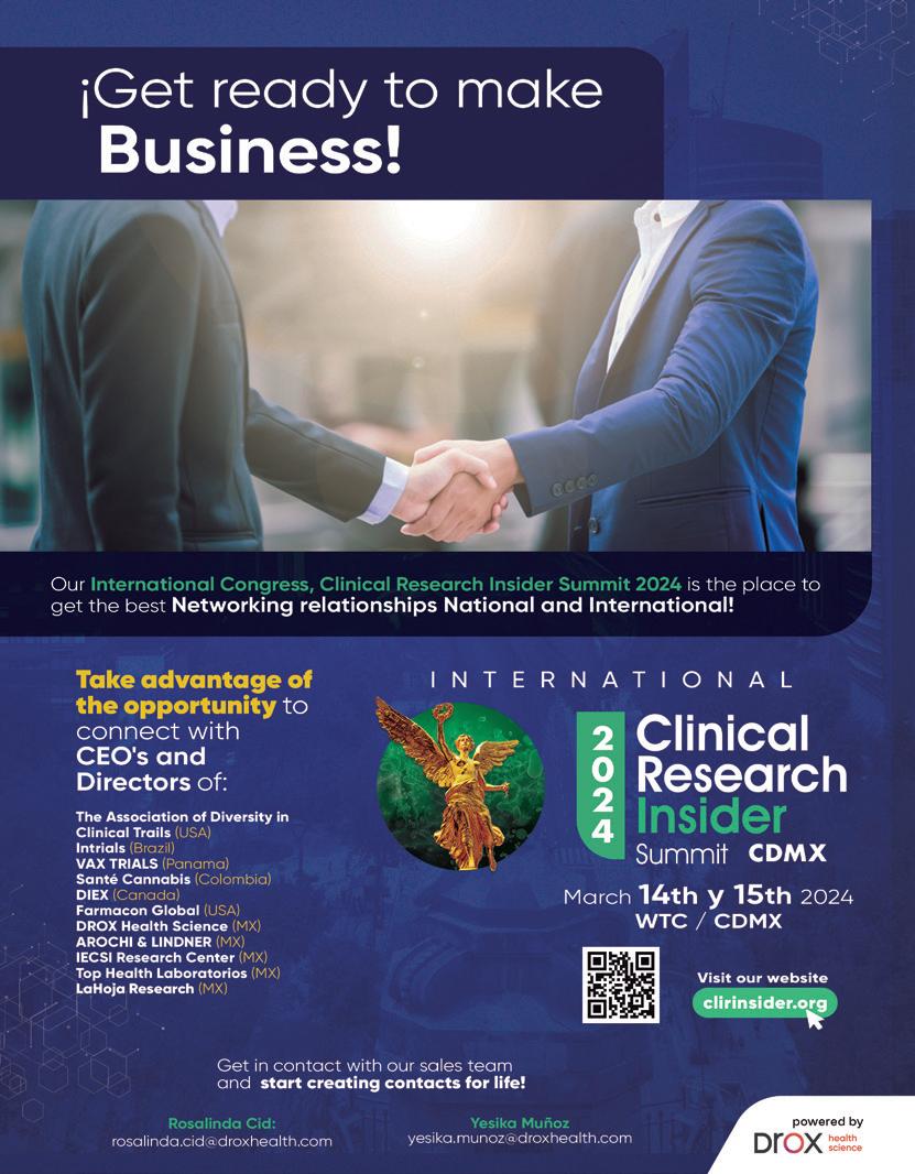 ADVERTISE YOUR COMPANY ON CLINICALRESEARCHINSIDER! yesika.munoz @droxhealth.com / (52) 33 16 95 59 95 Clinical Research Insider magazine, year 4, no. 12, active circulation September-October-November 2023, is a trademark of CRPS CLINICAL RESEARCH PROFESSIONAL SERVICES, LLC. All rights reserved. Clinical Research Insider is a bimonthly publication, edited in 12550 Biscayne Blvd., Ste. 110, Miami, FL. 33181 USA. Contact telephone: (+1) 786 269 0937. Responsible Editor: CRPS CLINICAL RESEARCH PROFESSIONAL SERVICES. E-mail: carolina.villanueva@ clirinsider.org. The content of articles and advertising is the responsibility of their authors and sponsors. Clinical Research Insider is not responsible for the information in the advertising content. Prices shown in this publication are for informational purposes only and are subject to change. ADMINISTRATIVE ASSISTANT COMMUNITY MANAGER Francisco