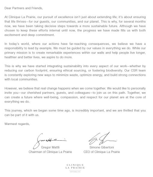 Since 2022, Clinique La Prairie SA has been working on improving its Corporate Social Responsibility (CSR). This commitment to raising ecological awareness through its development was established by the Top Decision-Making Board. To ensure a better future for the next generations, we created these CSR guidelines, which are intended for all new resort construction projects. This document should be reviewed with great attention.