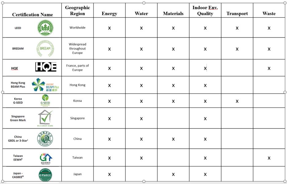 Out of them LEED and BREEAM are available worldwide, whereas the other has typically only a national diffusion but may be extremely popular in their country of origin. As Exhibit 1 shows, some of these certification schemes address more topics than others
