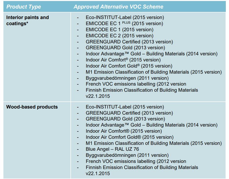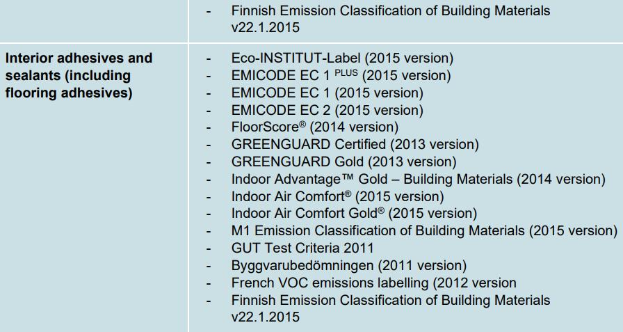 Accepted product scheme that are compliant with the BREEAM 2016 or LEEDv4 Certifications.