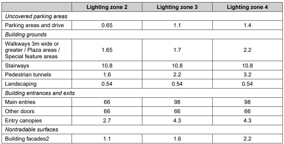 Legend : External power limits per each lighting zone, in Watt/m2 (the value is in W/m2 of illuminated wall area)