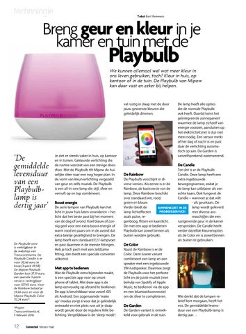 Tot slot is er de Playbulb Candle. Deze lamp heeft een extra ingebouwde De Playbulb verschijnt in dibewegingssensor, zodat je verse versies. Als eerste is er de de lamp kan uitblazen als een Rainbow, de basisversie van de echte kaars. Ook fungeert de lamp. Deze Rainbow beschikt Candle ‒ wanneer je dat wilt over standaard wit, rood, - als geurkaars. De groen en blauw. lamp wordt geleverd Verder biedt de BINNENKORT IN DE PROBEERSERVICE! met diverse arolamp lichteffecten maschijfjes die een zoals pulse, rerustgevende geur in de kamer genboog, flitsen en kaarslicht. verspreiden. De Candle heeft De met een app te bedienen verder dezelfde kleurenopties Playbulb kan zowel binnen als als de Color en is zowel binnen buiten worden gebruikt. als buiten te gebruiken.