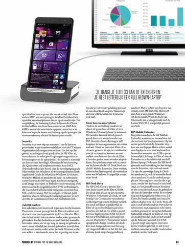aandoet. Het is echter een kwestie van smaak, want HP laat zelfs Microsoft zien hoe je een goede Windows 10-dock maakt. Want de dock van Microsoft, die je dus gebruikt met de Lumia 950 (XL), is eigenlijk gewoon een hub. HP Mobile Extender Nog interessanter is de HP Mobile Extender, waarvan we verwachten dat die wel wat stof doet opwaaien. Op het eerste gezicht doet de Extender denken aan een laptop. Het is echter enkel een display en accu met keyboard en bovendien voorzien van USB-c-poort (natuurlijk). Je hangt je Elite x3 aan de Extender en je hebt letterlijk een full blown-laptop. De keuzes die HP heeft gemaakt met betrekking tot het design van de Extender, zijn ook wel uniek. Zo zijn de aanwezige Bang & Olufsen-speakers (ja, ook de extender heeft deze speakers!) aan de onderkant geplaatst. Navraag leert ons dat dit is gedaan, omdat het keyboard in een hoek staat, en het geluid bouncet hierdoor in een correcte hoek naar de gebruiker die aan de Extender werkt. Er is echter nog een belangrijkere reden voor. De Extender heeft namelijk een bijna bezelloos display van 12.5-inch. En ja, dit ziet er indrukwekkend uit. Het scherm is trouwens mat, waardoor ook buiten werken gewoon tot de opties behoort. Natuurlijk schakelt de Elite x3 over op de desktopmodus zodra je het toestel op de Extender aansluit. De USBc-poort zorgt vervolgens voor zero latency tijdens gebruik en dat is zeer welkom wanneer je werkt, zoals iedere mobiele werker wel weet.