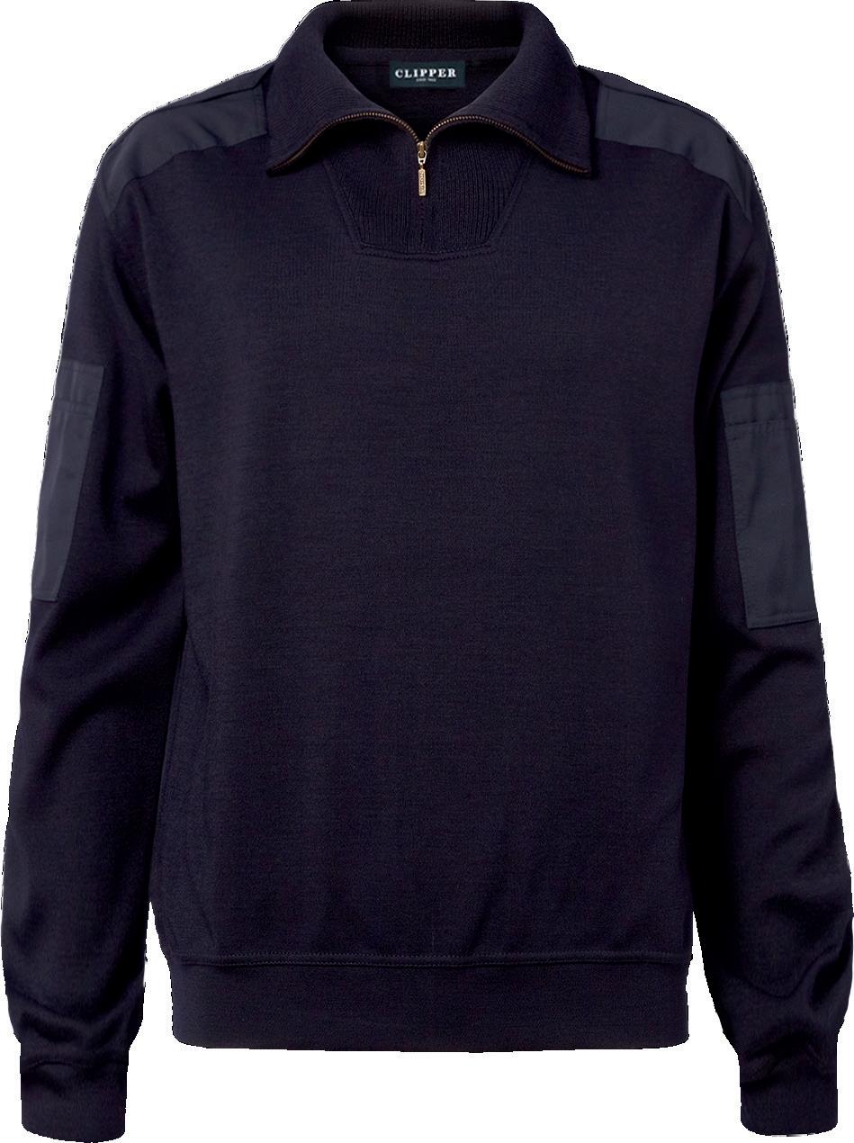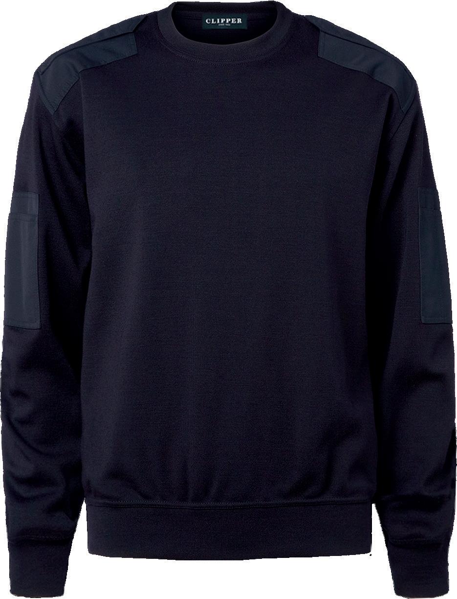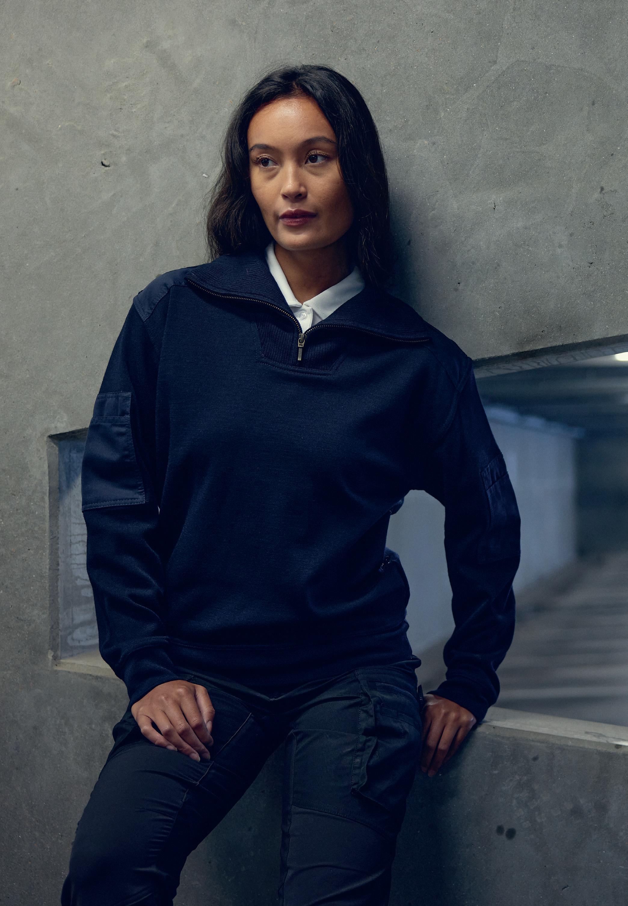 Made from a blend of wool and acrylic · Offers the natural benefits of wool, including moisture-wicking, temperature regulation and odour resistance · Acrylic provides durability and high shape retention · A quality that provides structure and weight for a solid feel Extremely durable and resistant to wear Designed for authority, function, and signal value · Shoulder straps and twill reinforcement on shoulders and elbows Pockets on both upper sleeves – one with a vertical pen slot, the other designed for small essentials · Ribbing in fabric