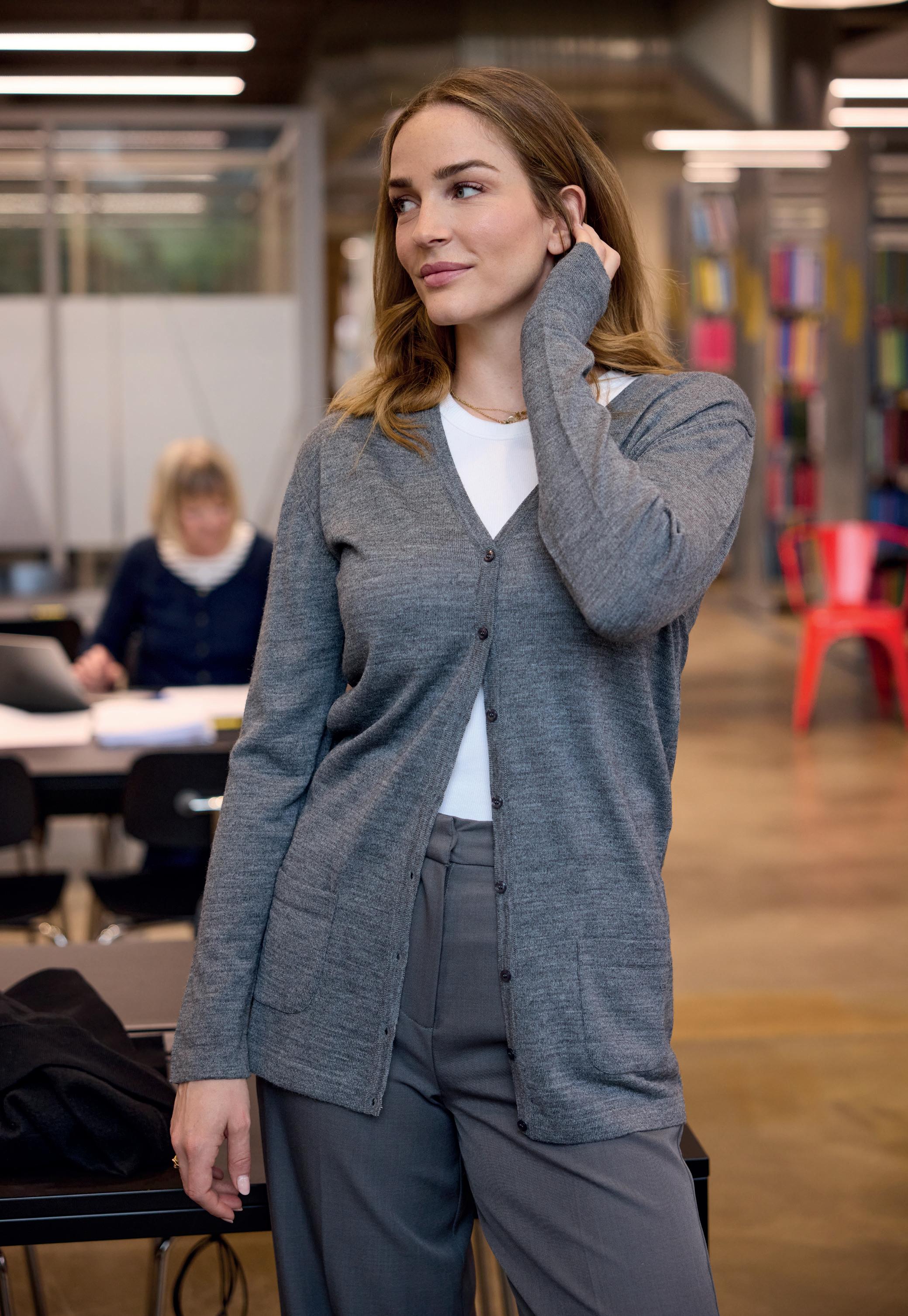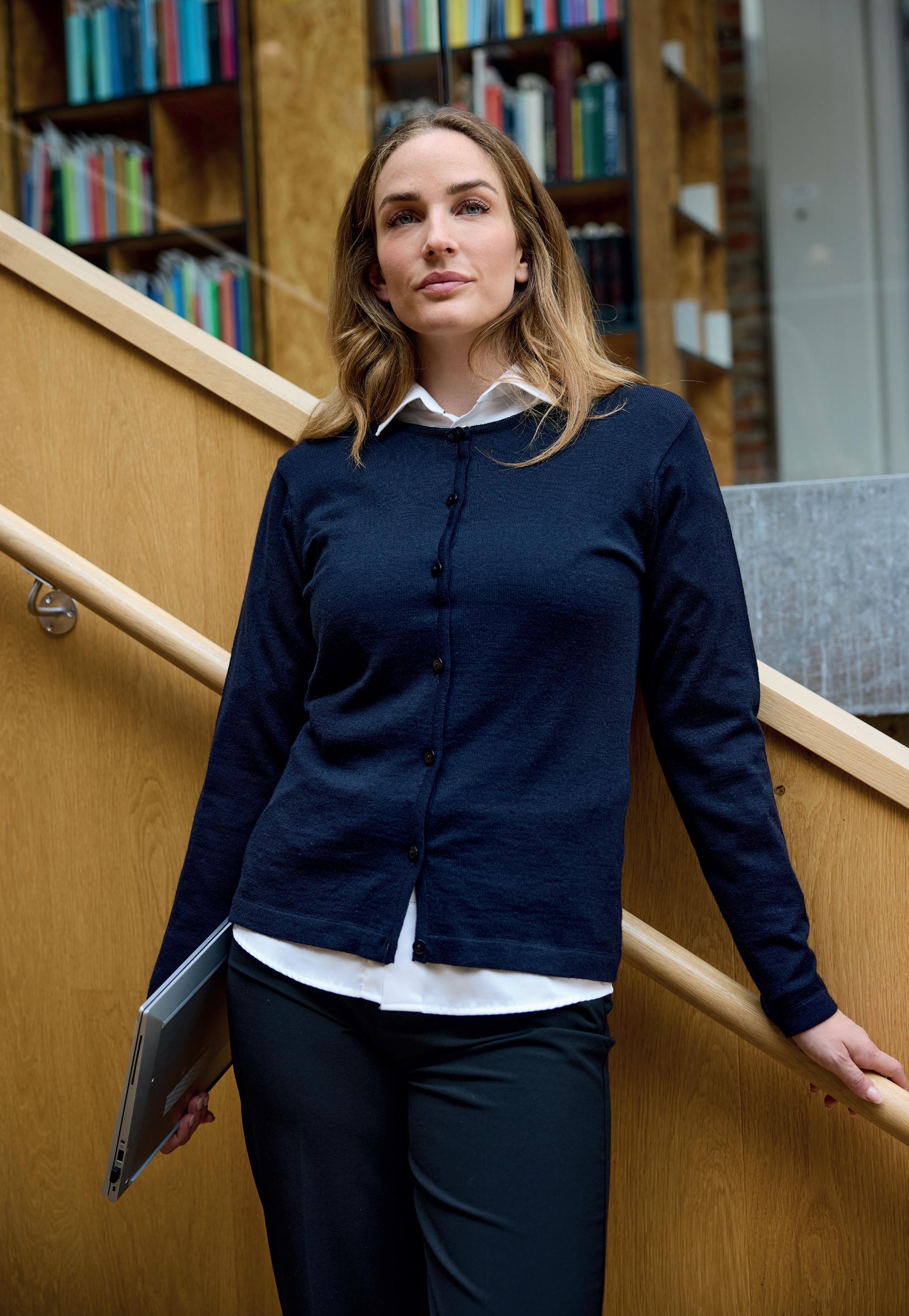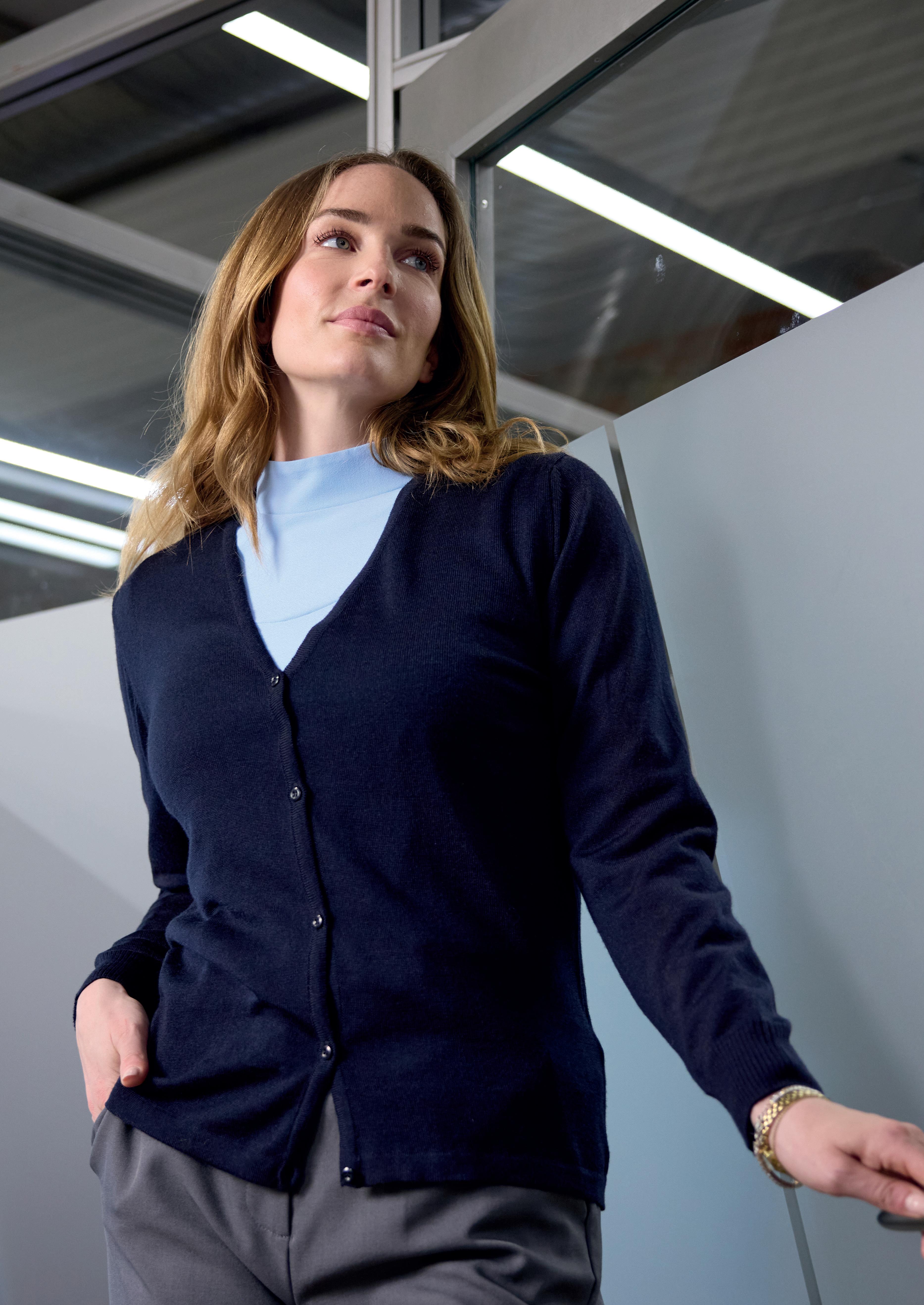 Made from a fine blend of thin merino wool and acrylic for a lightweight knit · Offers the natural benefits of wool, including moisture-wicking, temperature regulation and odour resistance · Acrylic provides durability and high shape retention · Widest collection with the largest range of styles and sizes · Mix and match pieces to create a uniform look across job functions · Extremely durable and resistant to wear · Tubular hem and cuffs for a classic and feminine look, buttons at placket, two front pockets