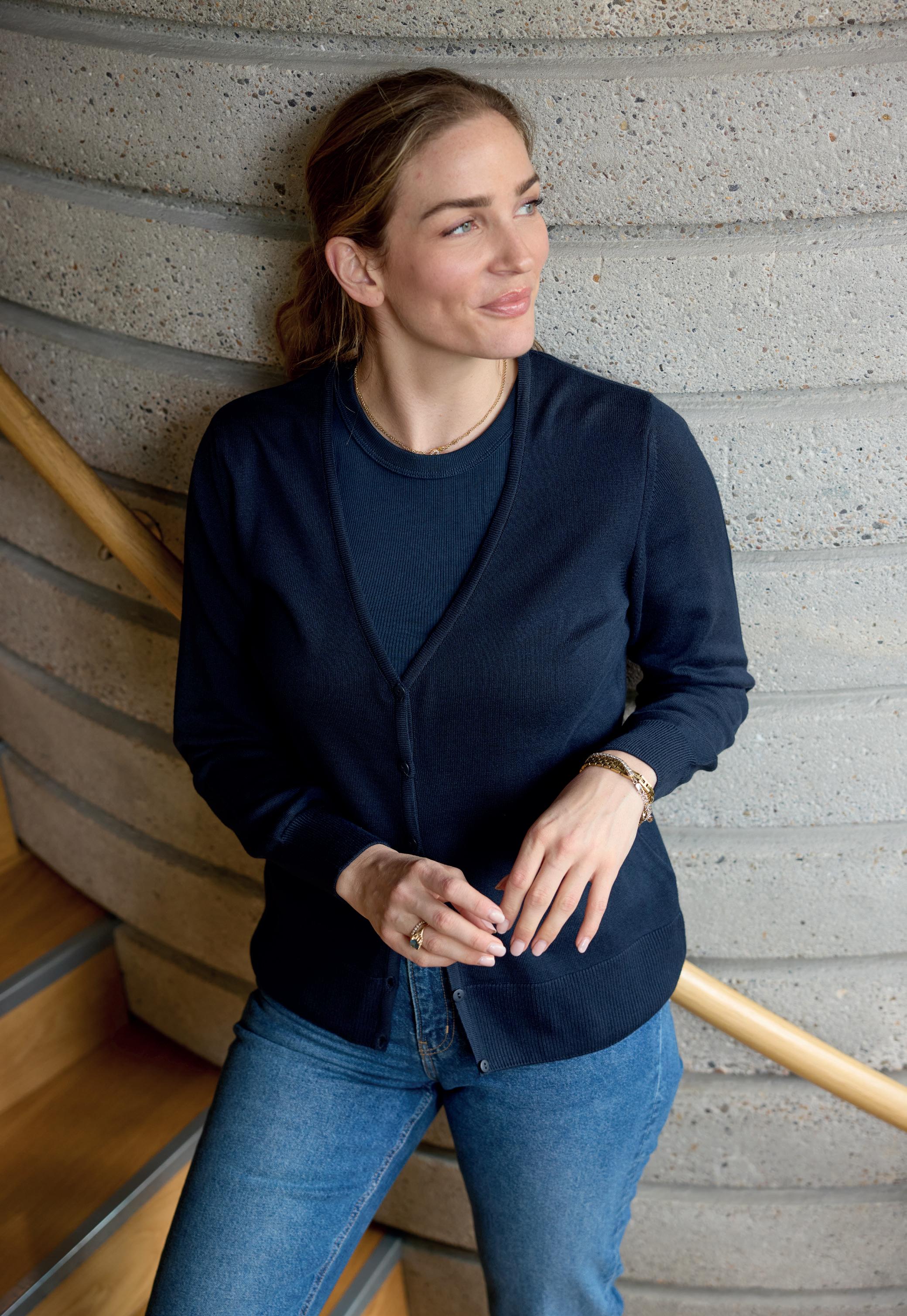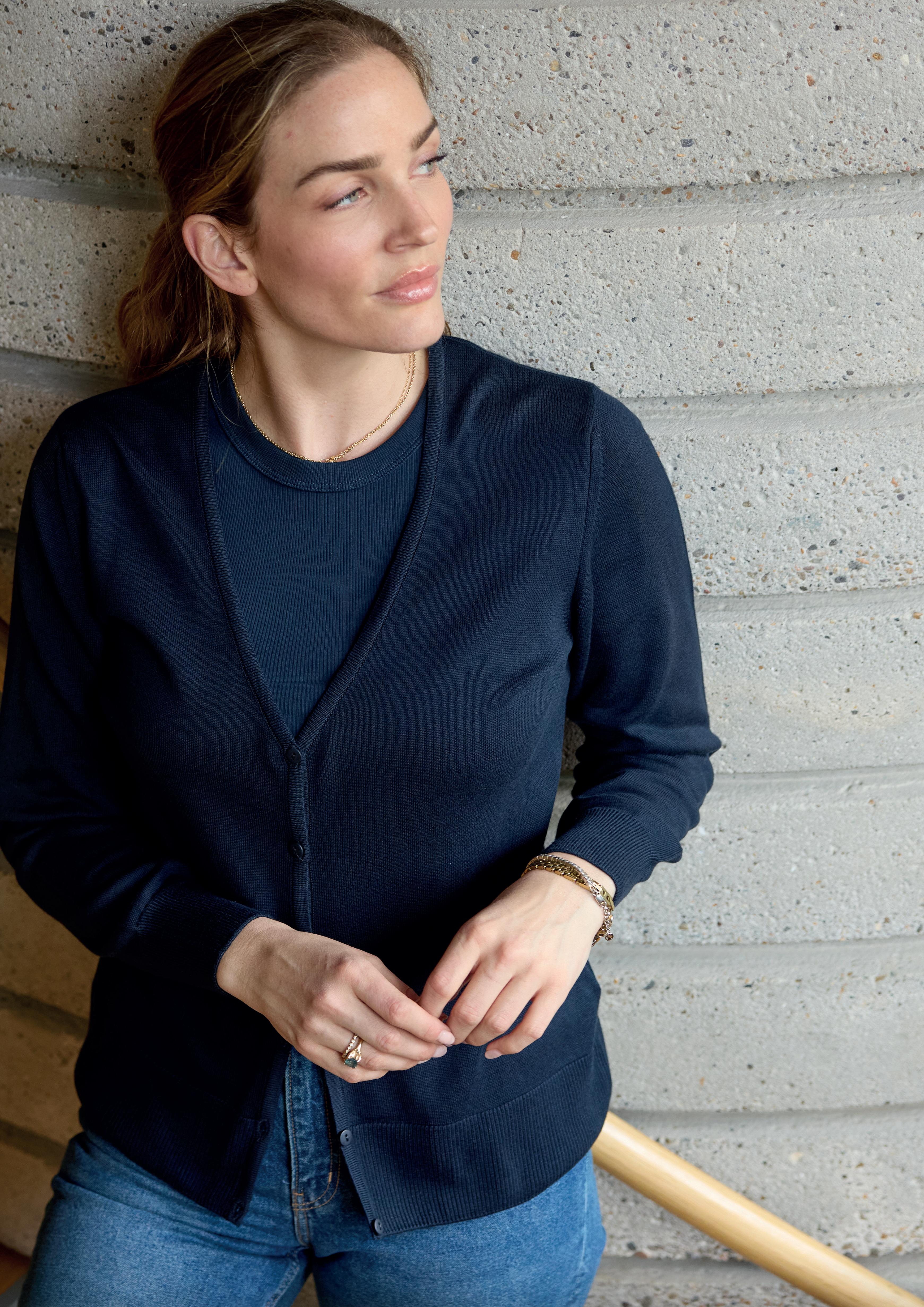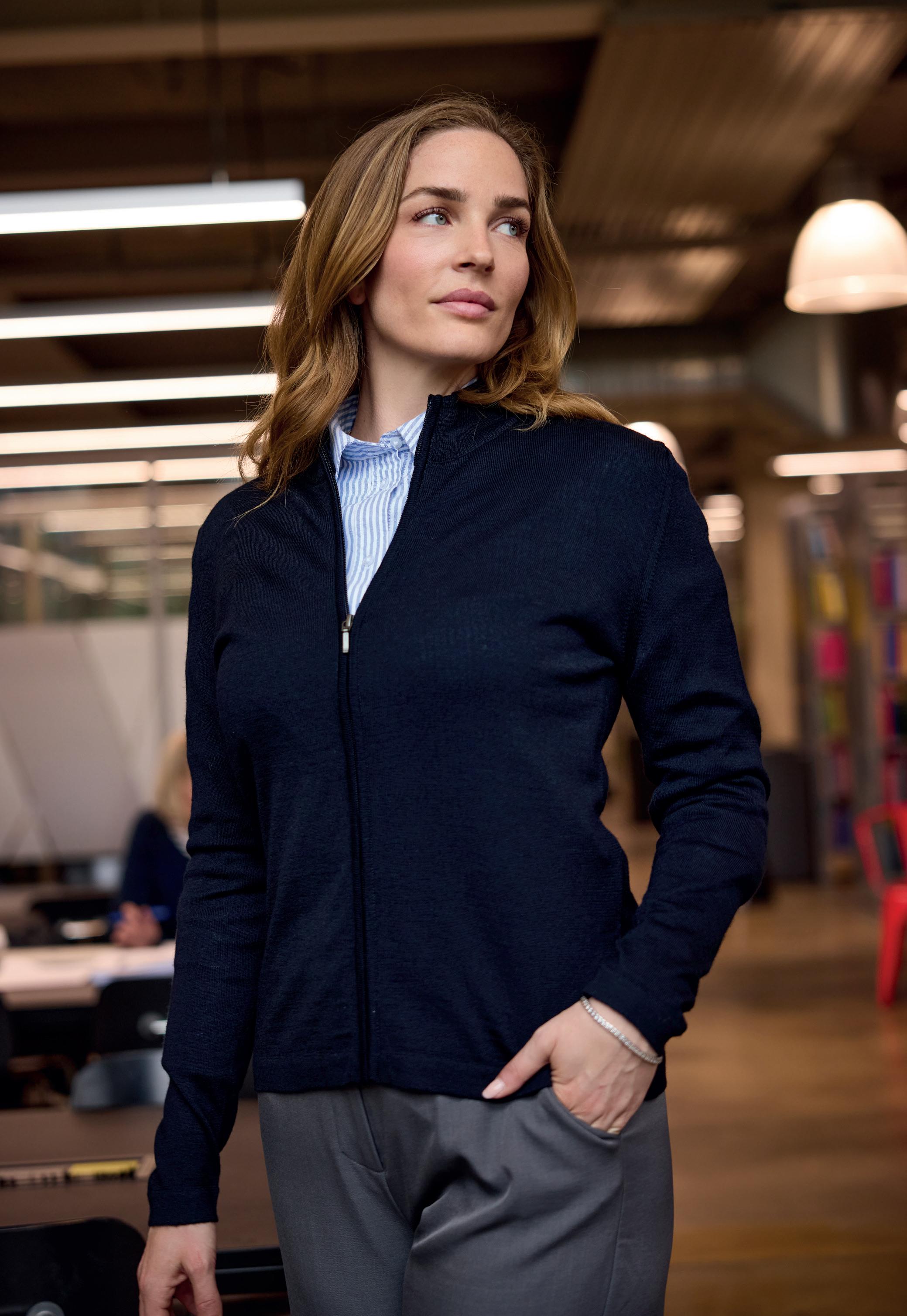 Made from a fine blend of thin merino wool and acrylic for a lightweight knit · Offers the natural benefits of wool, including moisture-wicking, temperature regulation and odour resistance · Acrylic provides durability and high shape retention · Widest collection with the largest range of styles and sizes · Mix and match pieces to create a uniform look across job functions · Extremely durable and resistant to wear · Tubular hem and cuffs for a classic and feminine look, buttons at placket, two front pockets