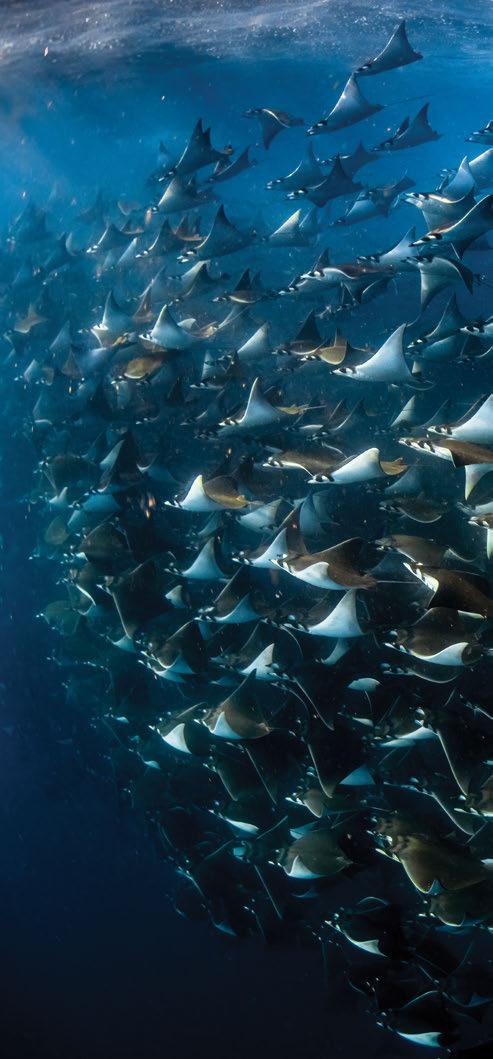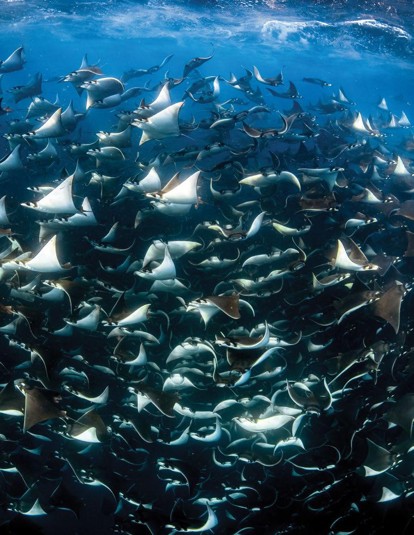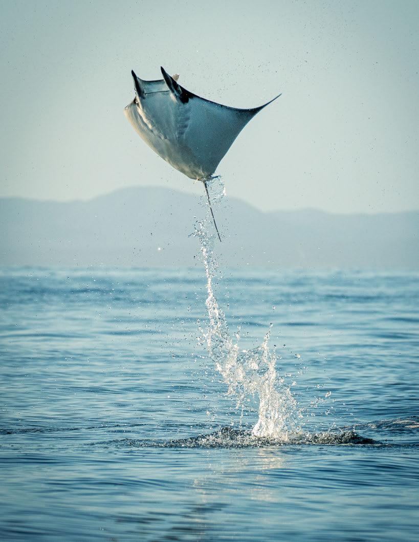 As the sun's warm, golden rays break over the horizon on the Sea of Cortez, they bring Baja to life and ignite one of Earth's most incredible natural spectacles. Within moments a splash breaks the dawn’s silence. It is followed by another, and yet another... until we begin to lose count. As our eyes scan the horizon, we see hundreds if not thousands of Munk’s Devil Rays (Mobula munkiana) launching themselves two metres into the air. The aggregation looks like it extends all the way out to the sun peaking over the horizon in the distance.