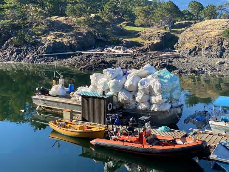 who work local beaches and accessible shorelines. Black, hard plastic dragger balls; weathered, hard, compressed plastic fishing net buoys; large fishing tow ropes; polystyrene; various types of plastic, single-use bottles; and even household appliances damage sensitive habitats. Derelict fishing line and rope and even remnants of nets are also carried off the beaches and stuffed into 20 super sacks over a seven-day period. On this trip, we covered Carpenter Bay, Collison Bay, Ikeada Cove, and a bit of Scutter Point with more day trips to complete before the end of the initiative.