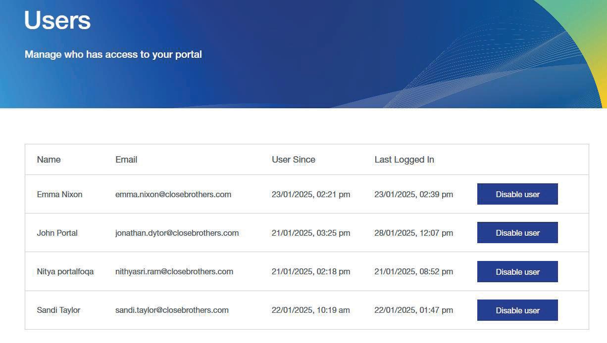 You can view the names of anyone with access to your account within the portal. Click on ‘disable user’ to remove anyone who no longer needs access.