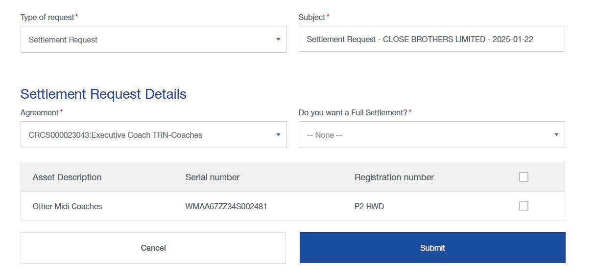 You can raise a settlement request for a specific asset directly from the agreements page.