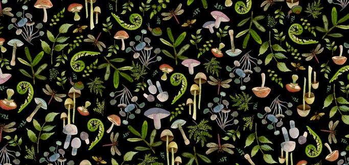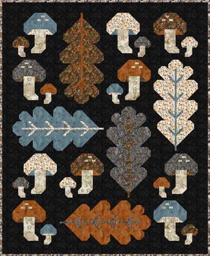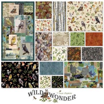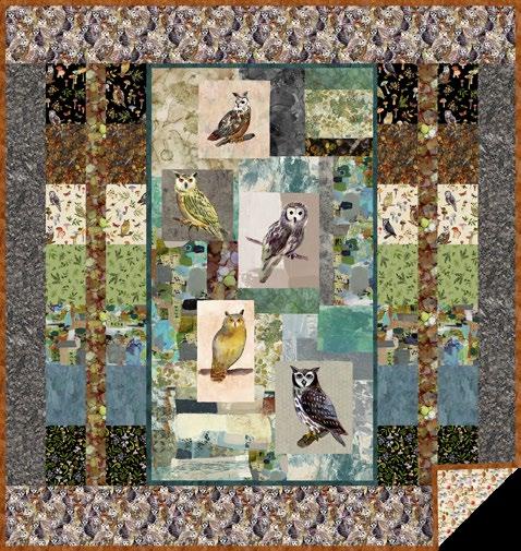Fabrics, Black version: Lt Cream version: 1 Kit 10 Kits 20 Kits Color 1: Teal Digital Watercolor Tonal Y4083-104 Olive Digital Fronds Y4077-24 ⅝ yd 1 bolt 1 bolt Color 2: Dk Pewter Digital Agate Y4084-120 Lt Brown Digital Moss Stones Y4080-14 ⅝ yd 1 bolt 1 bolt Color 3: Dk Caramel Digital Stones Y4082-66 Dk Caramel Digital Stones Y4082-66 ⅝ yd 1 bolt 1 bolt Color 4: Dk Rust Digital Watercolor Tonal Y4083-72 Dk Rust Digital Watercolor Tonal Y4083-72 ⅝ yd 1 bolt 1 bolt Color 5: Butter Digital Mushrooms Y4079-59 Black Digital Forest Floor Y4078-3 ⅝ yd 1 bolt 1 bolt Color 6: Khaki Digital Sandstone Y4081-12 Khaki Digital Sandstone Y4081-12 ⅜ yd 1 bolt 1 bolt Background: Black Dappled Y2949-3 Lt Cream Impressions Moiré Y1323-2 3 yds 2 bolts 4 bolts Binding: Multi Digital Packed Owls Y4074-55 Lt Cream Digital Fronds Y4077-2 ⅝ yd 1 bolt 1 bolt Backing: Black Digital Mushrooms & Owls Y4075-3 Butter Digital Mushrooms Y4079-59 3 ⅝ yds 3 bolts 5 bolts